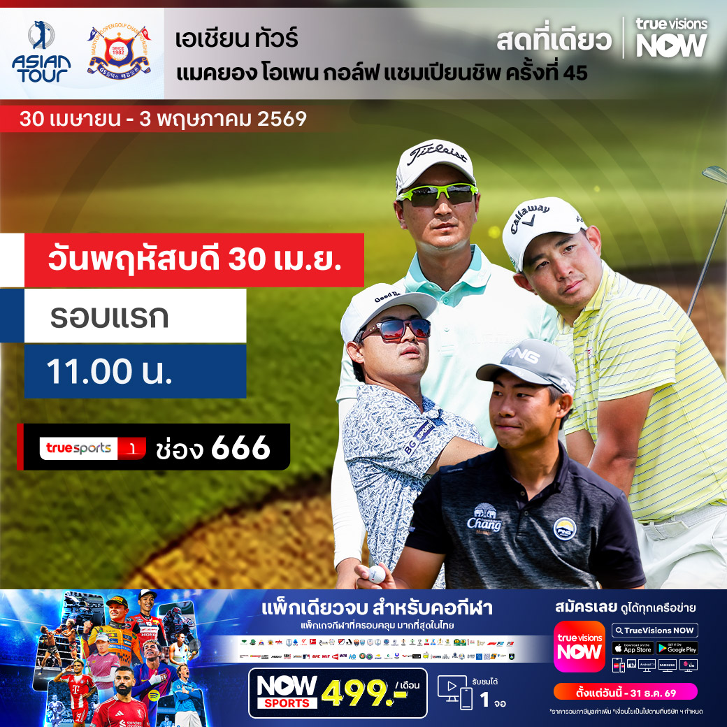 แฟนๆ กีฬากอล์ฟ ไม่ต้อรอ ไม่ต้องพัก ติดตามกันต่อเนื่องสำหรับการแข่งขัน เอเชียน ทัวร์ ฤดูกาล 2026 สัปดาห์นี้ โปรแถวหน้าของทัวร์ ไปรวมตัวกันที่แดนกิมจิ ประเทศเกาหลีใต้ เพื่อดวลวงสวิงและลุ้นแชมป์ในรายการ แมคยอง โอเพ่น กอล์ฟ แชมเปี้ยนชิพ ครั้งที่ 45 ที่สนาม นัมโซล คันทรี่ ชิงเงินรางวัลรวม 28.2 ล้านบาท ร่วมใจเชียร์โปรไทย ทำสกอร์แข่งกับโปรจากนานาชาติ ชมสด เอ็กซ์คลูซีฟ ครบทุกรอบ ที่ ทรูวิชั่นส์