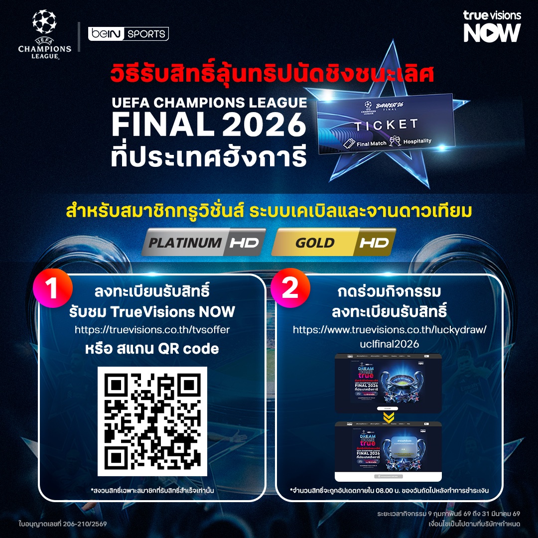 ผู้ร่วมกิจกรรมต้องทำการยืนยันการรับสิทธิ์ผ่าน Website https://www.truevisions.co.th/luckydraw/uclfinal2026 ภายในวันที่ 9 กุมภาพันธ์ 2569 – 31 มีนาคม 2569 ให้เรียบร้อย ถึงจะได้รับสิทธิ์โดยสมบูรณ์ หากไม่ดำเนินการภายในระยะเวลาที่กำหนด จะถือว่าสละสิทธิ์โดยอัตโนมัติ