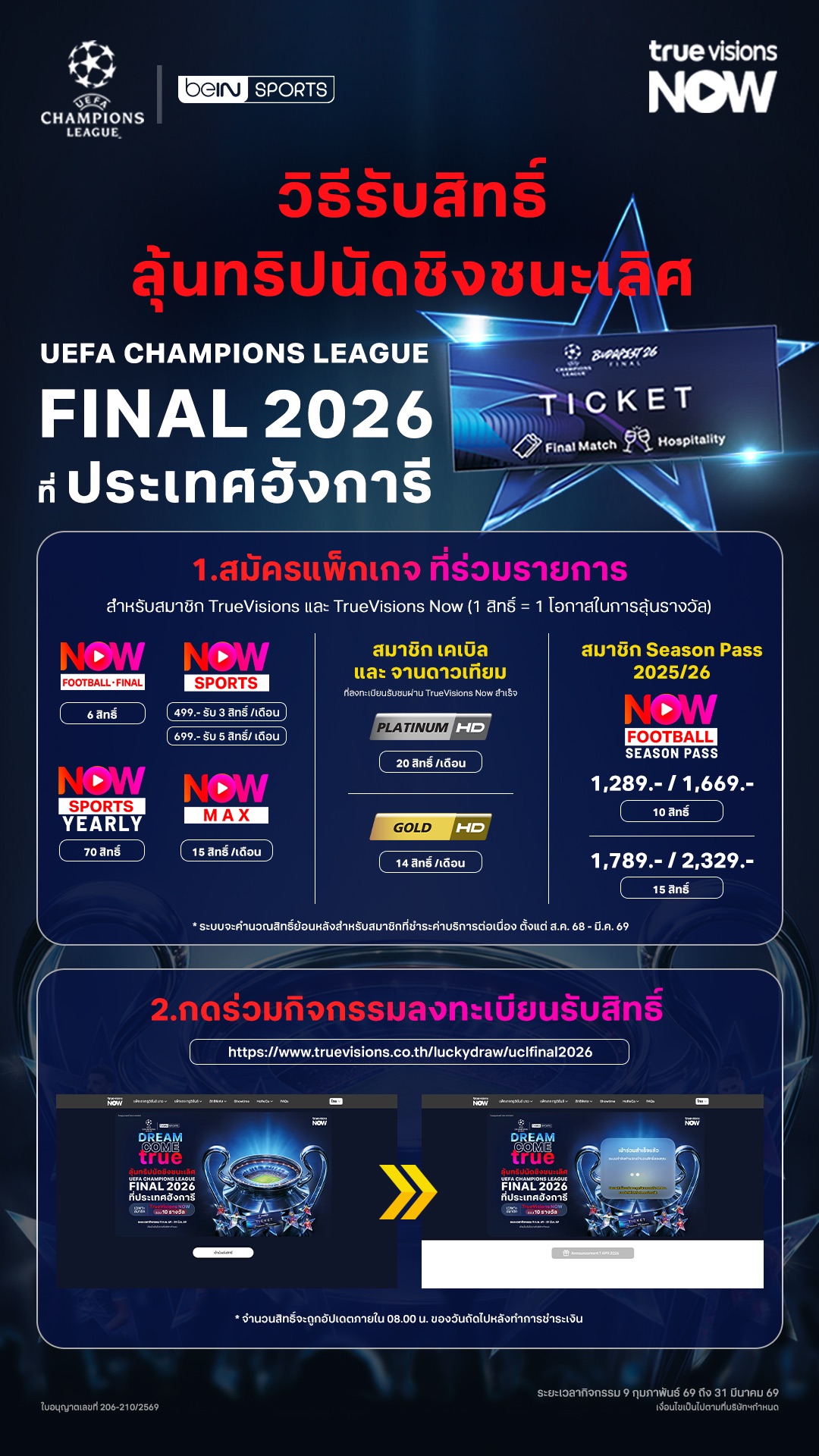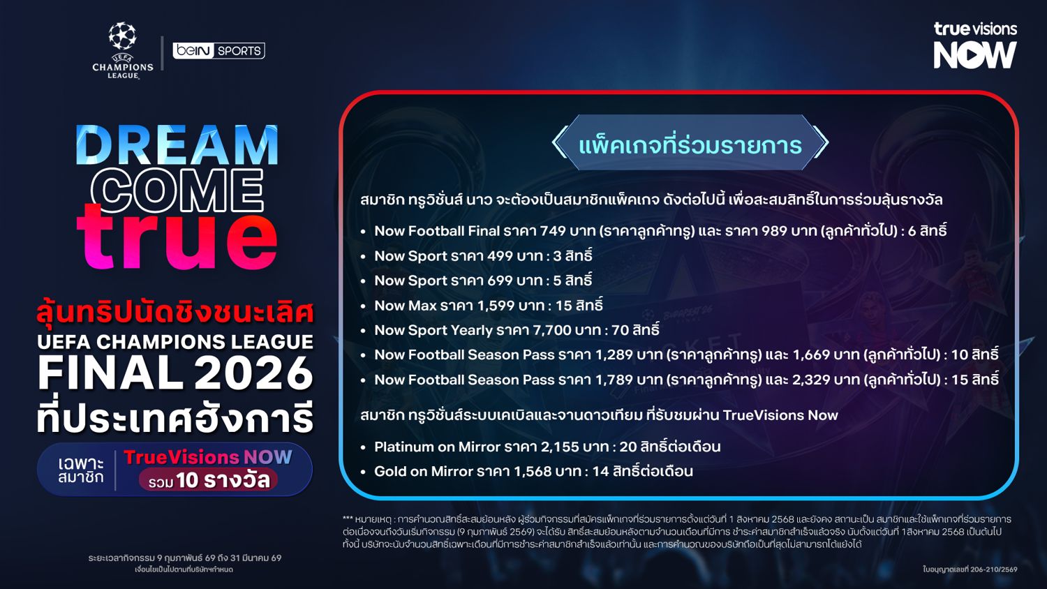 1. กิจกรรม “Dream Come True – ลุ้นทริปนัดชิงชนะเลิศ UEFA Champions League FINAL 2026 ที่ประเทศฮังการี” นี้ สำหรับผู้ใช้บริการของบริษัท ทรู วิชั่นส์ กรุ๊ป จำกัด และ บริษัท ไบรท์นาว จำกัด (รวมเรียกว่า “บริษัท”) ซึ่งเป็นสมาชิก ทรู วิชั่นส์ หรือ ทรู วิชั่นส์ นาว ในนามบุคคลธรรมดา ที่มีสถานะของการใช้งานเป็นปกติ (Active Status) (“ผู้ใช้บริการ”) โดยผู้ใช้บริการต้องสมัครแพ็กเกจตามเงื่อนไขในการเข้าร่วมกิจกรรม และทำการยืนยันการรับสิทธิ์ผ่าน Microsite ให้เรียบร้อย (“ผู้ร่วมกิจกรรม”) โดยกิจกรรมนี้ จัดขึ้นตั้งแต่วันที่ 9 กุมภาพันธ์ 2569 ถึงวันที่ 31 มีนาคม 2569 หรือจนกว่าจะมีการแจ้งเปลี่ยนแปลงจากบริษัท