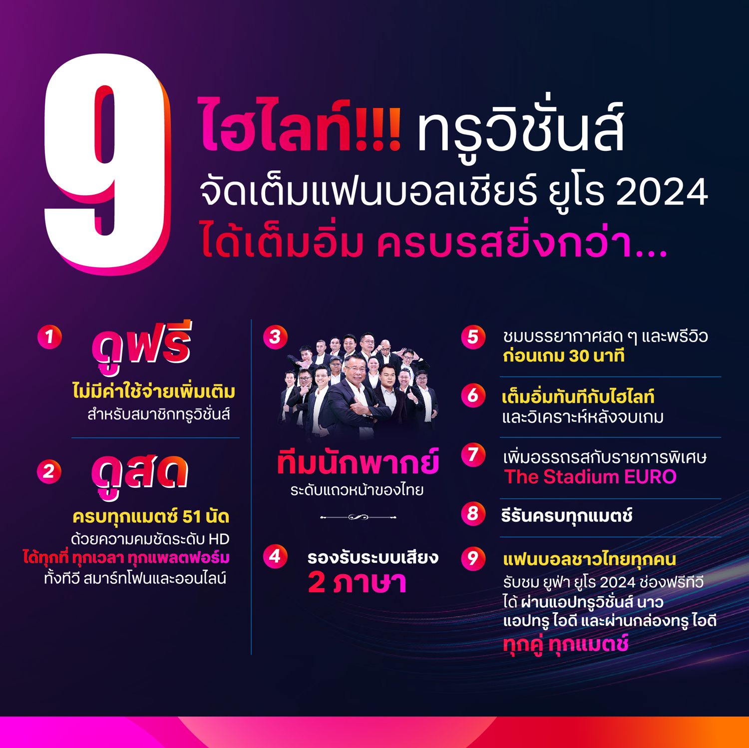 ลูกค้าปัจจุบันทั้งบนแอปใหม่ TrueVisions Now หรือ TrueVisions Now บน TrueID และ ลูกค้าชุดเช่า TrueVisions ระบบเคเบิ้ลและจานดาวเทียม สามารถรับชมได้ โดยรายละเอียดแพ็กเกจที่ได้รับสิทธิ ดังนี้ กรณีลูกค้าปัจจุบันบนแอปใหม่ TrueVisions Now - แพ็กเกจ NOW Plus รับชม EURO 2024 ได้ตั้งแต่ 15 มิถุนายน 2567 - 15 กรกฎาคม 2567 กรณีลูกค้าปัจจุบัน TrueVisions ระบบเคเบิ้ล และจานดาวเทียม 1. ลูกค้าชุดเช่า แพ็กเกจ Happy, Smart Family, Sport Family, Super Family, Gold และ Platinum (สำหรับสมาชิก Happy Family เมื่อการแข่งขัน EURO 2024 สิ้นสุดลง สมาชิกจะได้รับชมช่องตามแพ็กเกจ Happy Family ตามปกติ) 2. แพ็กเกจเสริม EPL, EPL&UEFA แบบรายเดือน 3. แพ็กเกจเสริม EPL แบบ 3 ฤดูกาล รับชม EURO 2024 ได้ตั้งแต่ 15 มิถุนายน 2567 - 15 กรกฎาคม 2567 กรณีลูกค้าปัจจุบัน TrueVisions NOW บนแอป/เว็บไซต์ TrueID 1. แพ็กเกจ TVS NOW Standard-NOW Platinum 2. แพ็กเกจเสริม NOW EPL&UEFA แบบรายเดือน เพื่อรับชม EURO 2024 ได้ตั้งแต่ 15 มิถุนายน 2567 - 15 กรกฎาคม 2567