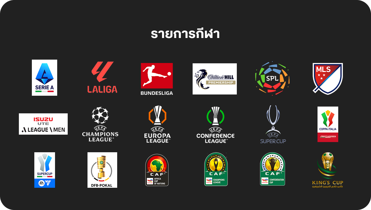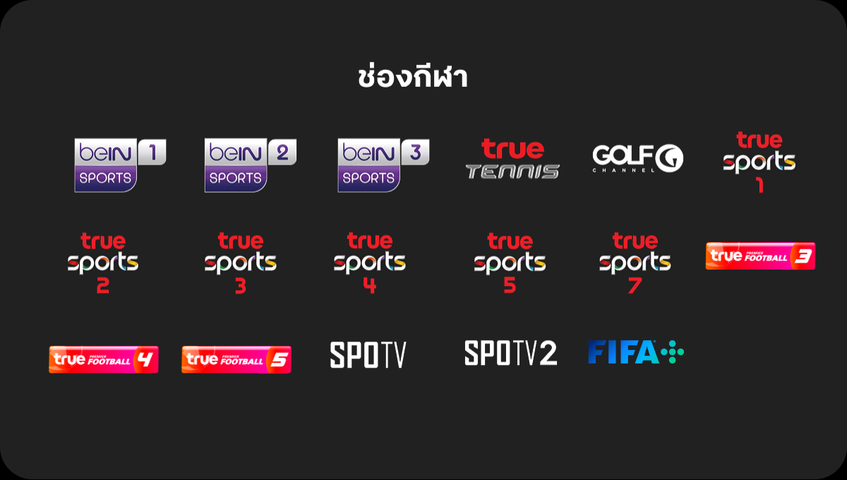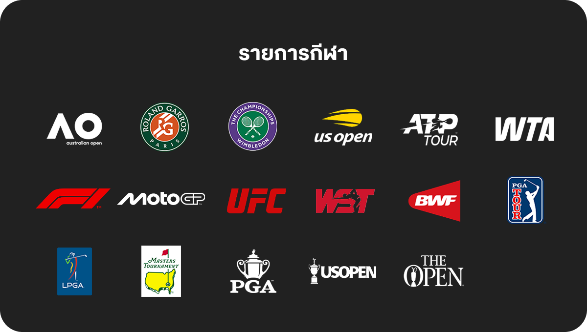 ฟุตบอล ทั้งไทย และต่างประเทศ,วอลเล่ย์บอล, แบดมินตัน, กอลฟ์, เทนนิส, F1, Motor GP, WRC, มวย และกีฬาอื่นๆ อีกมากกว่า 11,000 แมตช์