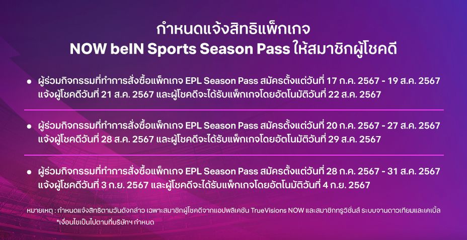 1. ผู้ร่วมกิจกรรมต้องสั่งซื้อแพ็กเกจ EPL แบบฤดูกาล ที่จำหน่ายทางช่องทางบริการโทรทัศน์แบบบอกรับสมาชิกของ TrueVisions ซึ่งให้บริการแพ็กเกจโดยบริษัท ทรู วิชั่นส์ กรุ๊ป จำกัด / ช่องทางแอปพลิเคชัน TrueVisions Now ซึ่งให้บริการแพ็กเกจโดยบริษัท ไบรท์ นาว จำกัด / ช่องทางแอปพลิเคชัน TrueID ซึ่งให้บริการแพ็กเกจโดยบริษัท ทรู ดิจิทัล กรุ๊ป จำกัด (รวมเรียกผู้ให้บริการในแต่ละช่องทางว่า “ผู้ให้สิทธิ”) ในระหว่างวันที่ 17 กรกฎาคม 2567 ถึงวันที่ 31 สิงหาคม 2567