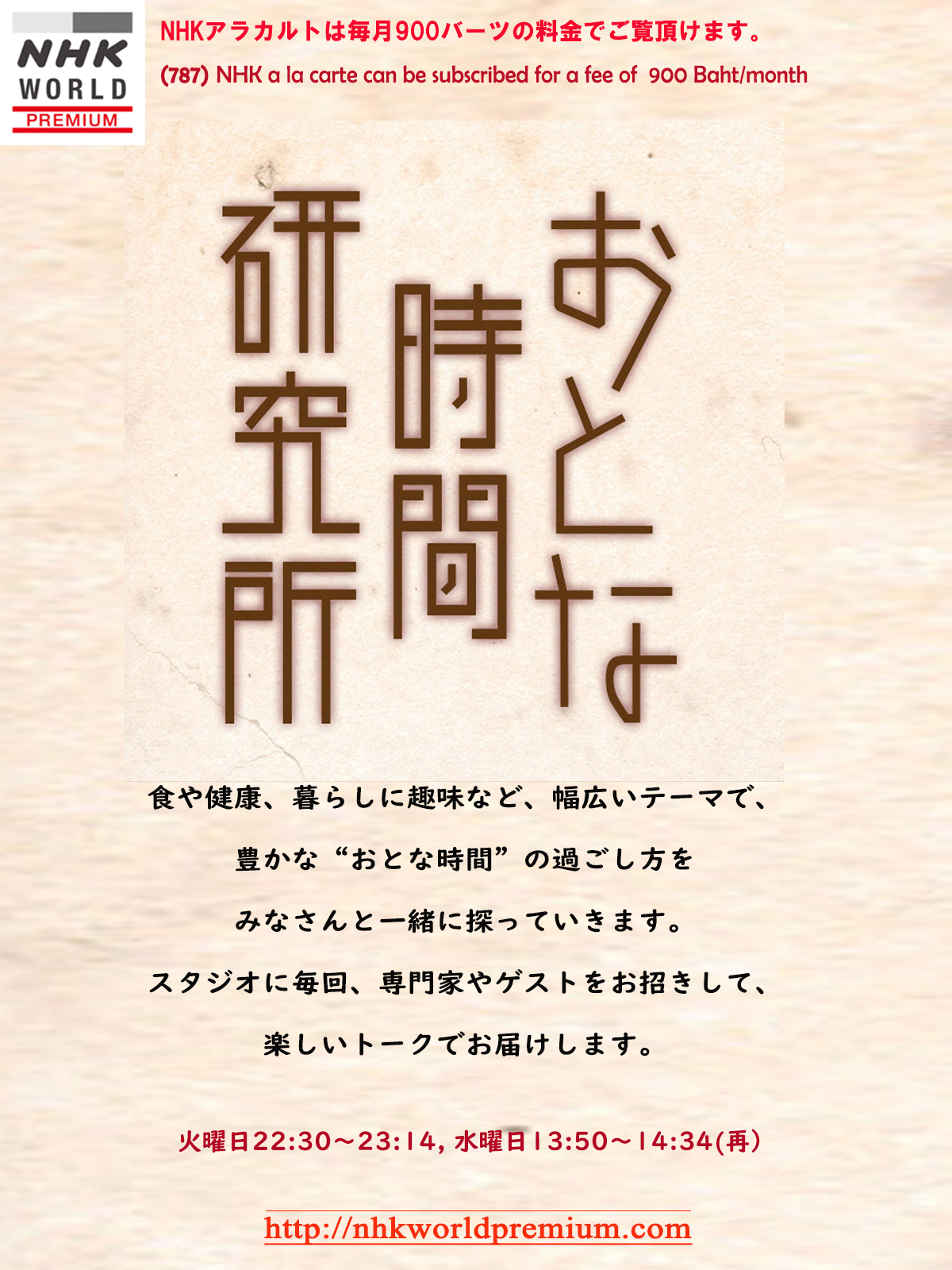 This high-quality educational program, hosted by Tokiwa Takako, is designed for middle-aged and senior viewers with more free time, exploring ways to enjoy a fulfilling adult life through various topics, including food, health, and lifestyle.