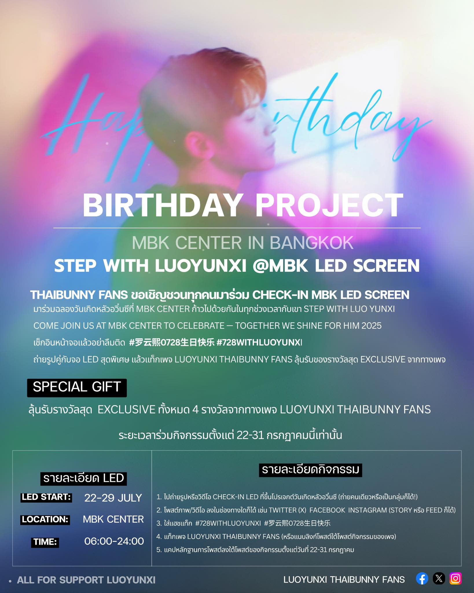 กลุ่มแฟนคลับ Luoyunxi ThaiBunny Fans ขอเชิญทุกคนมาร่วมเป็นส่วนหนึ่งของการเฉลิมฉลองวันเกิดของหลัวอวิ๋นซี ที่ MBK Center กับคอนเซปต์สุดเก๋ "The One and Only Star – เปล่งประกายให้โลกได้เห็น!" ด้วยความตั้งใจของโปรเจกต์ที่เต็มเปี่ยมไปด้วยความรักที่พวกเราเหล่ากระต่ายแสดงออกผ่านจอ แค่ได้เห็นชื่อของเขาส่องสว่างท่ามกลางเมืองใหญ่ก็เหมือนเป็นการบอกให้รู้ว่า "เรายังอยู่ตรงนี้" และพร้อมก้าวไปกับเขาเสมอ