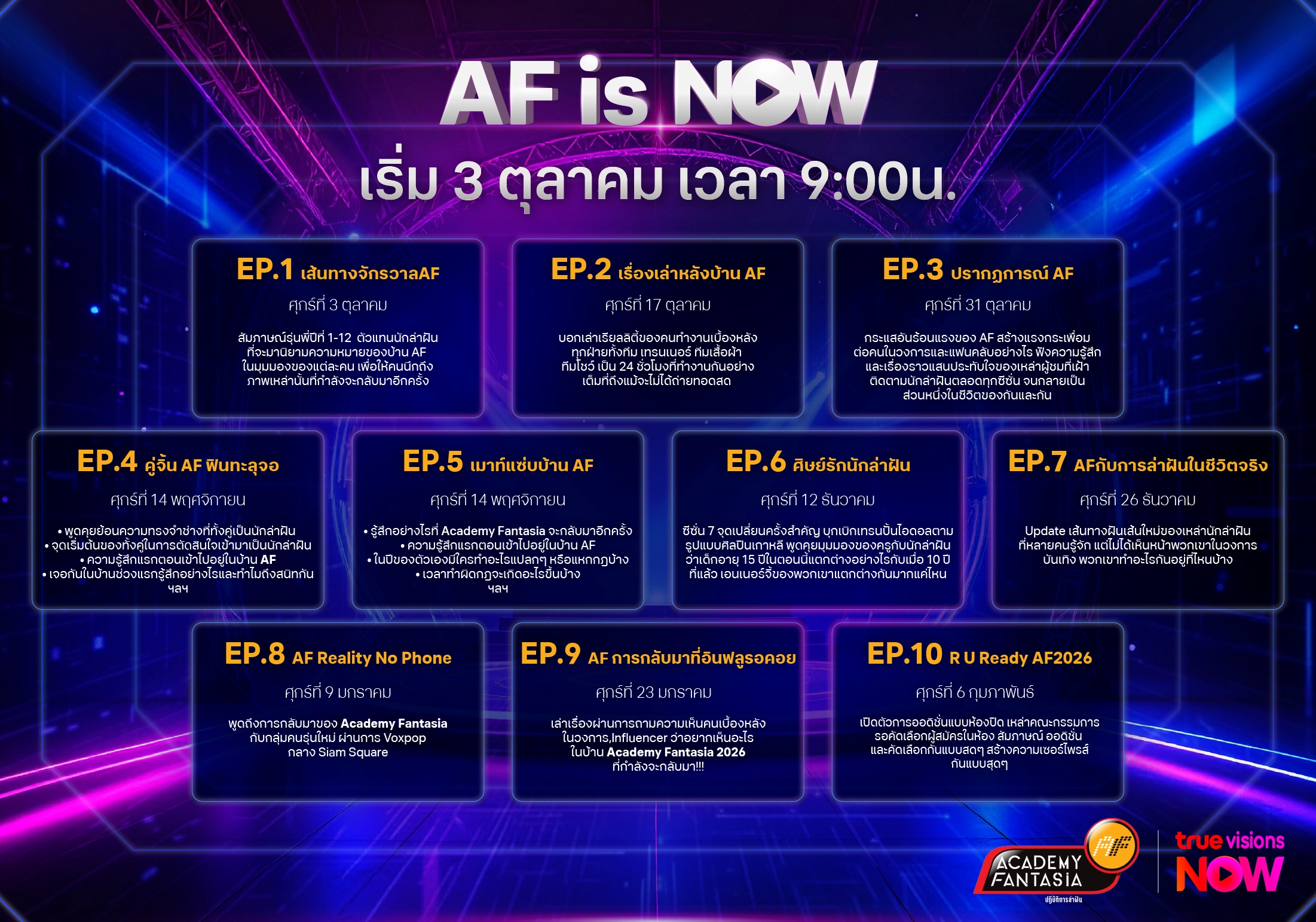 กับรายการพิเศษสุด “AF IS NOW” ที่จะพาทุกคนย้อนกลับไปดื่มด่ำกับความทรงจำอันแสนประทับใจ จากการแข่งขัน Academy Fantasia ทั้ง 12 ซีซั่นที่ผ่านมา ร่วมพูดคุยแบบเอ็กซ์คลูซีฟกับเหล่าศิลปิน AF, ครูใหญ่และคณะกรรมการของแต่ละซีซั่น เบื้องลึกเบื้องหลัง ตลอดจนความรู้สึกผูกพันอันแน่นแฟ้นของเหล่าแฟนคลับที่ติดตามชมรายการอย่างเหนียวแน่นตั้งแต่ซีซั่นแรก!