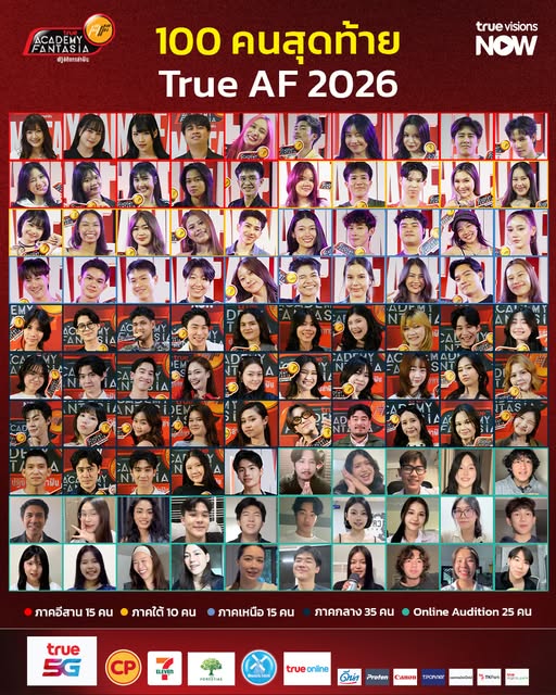 ได้เวลาเปิดตัวอย่างเป็นทางการ True Academy Fantasia 2026 (True AF 2026) เผยโฉมหน้า 100 ตัวแทนผู้ผ่านเข้ารอบสุดเข้มข้นจากทั่วประเทศและออนไลน์ เตรียมก้าวเข้าสู่รอบ Workshop & Final Audition ในวันที่ 25-26 เมษายน พ.ศ. 2569 ณ TK Park เพื่อค้นหา 12 นักล่าฝันตัวจริงที่จะได้เข้าไปใช้ชีวิตในบ้าน True AF และเริ่มต้นเส้นทางสู่การเป็นศิลปินในฝัน
