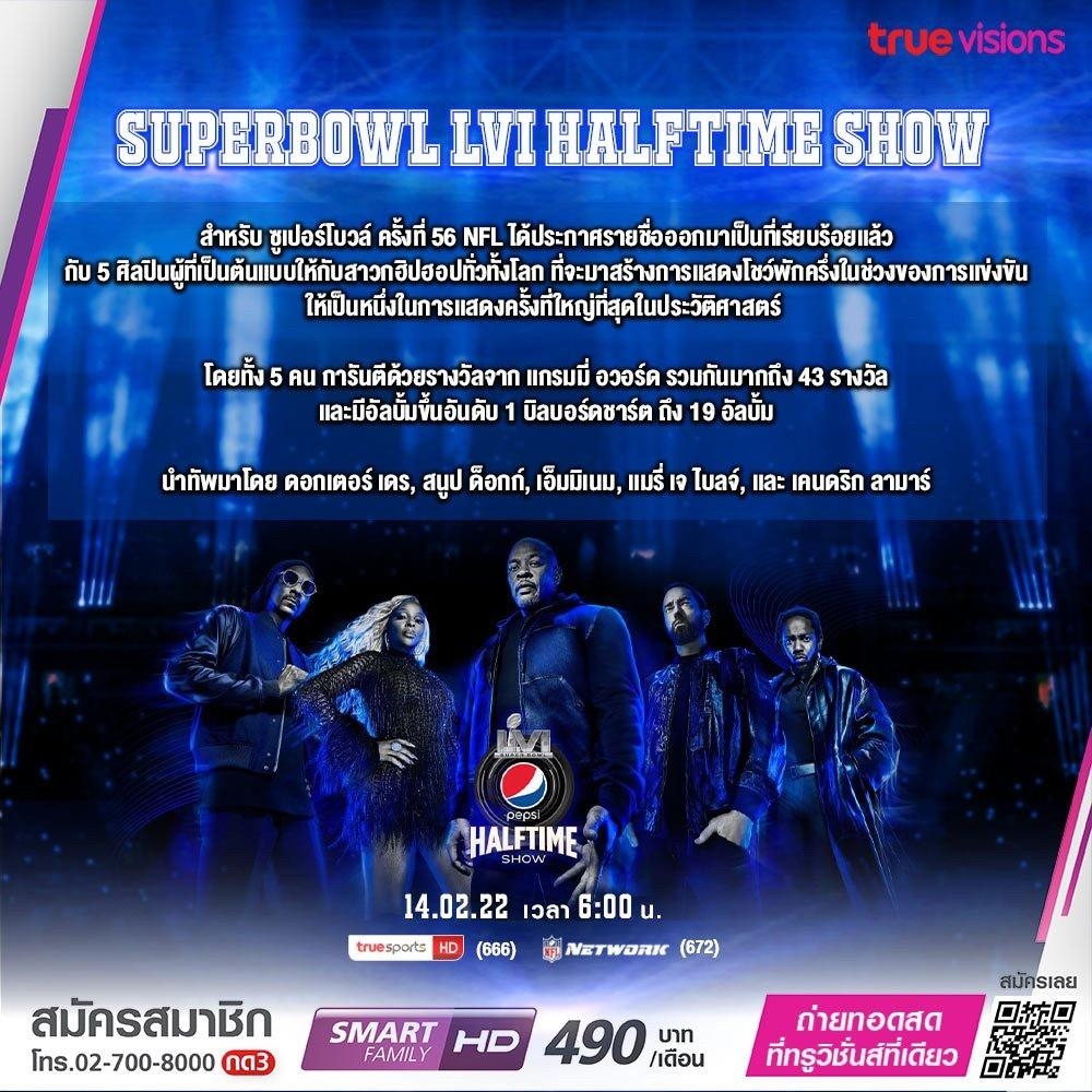 จัดหนัก จัดเต็มขนาดนี้ คอซูเปอร์โบว์ลและคอฮิปฮอปจะพลาดได้ยังไง เตรียมระเบิดความมัน เร้าใจและร่วมเป็นกำลังใจให้กับทีมรักของคุณได้ในวันจันทร์ที่ 14 ก.พ. 65 เวลา 06.30 น. (ตามเวลาในประเทศไทย)