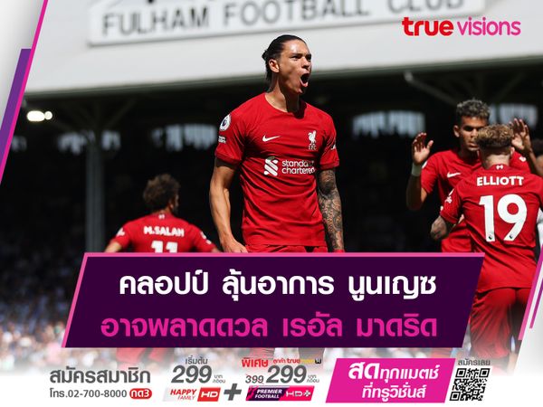 เยอร์เกน คลอปป์ ผู้จัดการทีมจอมเเท็คติคของ "หงส์แดง" ลิเวอร์พูล ทีมมีชื่อเเห่ง พรีเมียร์ลีก อังกฤษ เปิดเผยว่า ดาร์วิน นูนเญซ กองหน้าความเร็วสูง ได้รับบาดเจ็บที่บริเวณไหล่จากเกมที่เอาชนะ "เดอะ เเม็กพายส์" นิวคาสเซิล ยูไนเต็ด เเละอาจจะไม่มีชื่อดวลกับ "ราชันชุดขาว" เรอัล มาดริด ในช่วงกลางสัปดาห์