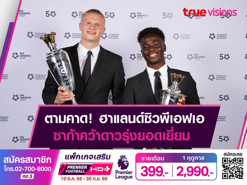 เออร์ลิ่ง ฮาแลนด์ กองหน้าทีมชาตินอร์เวย์ของ แมนฯ ซิตี้ คว้ารางวัลนักเตะยอดเยี่ยมแห่งปีของสมาคมนักฟุตบอลอาชีพอังกฤษ หรือ พีเอฟเอ ประจำฤดูกาล 2022-23 ไปครองตามความคาดหมาย หลังทำผลงานได้อย่างยอดเยี่ยมตลอดฤดูกาลที่ผ่านมา ขณะที่รางวัลดาวรุ่งยอดเยี่ยมแห่งปีตกเป็นของ บูคาโย่ ซาก้า กองหน้าจาก อาร์เซน่อล