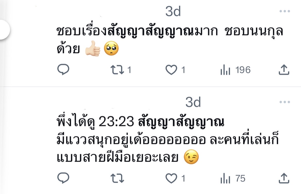สนุกเข้มข้นแบบขั้นสุดสำหรับซีรีส์สุดฮอต "23:23 สัญญาสัญญาณ" เรื่องราวของการย้อนเวลาโดยใช้การสื่อสารผ่านวิทยุ เป็นจุดเชื่อมโยงเรื่องราวทั้งหมด ซึ่งในเรื่องมีนักแสดงมากฝีมือหลายท่านแสดงอาทิ "แพนเค้ก เขมนิจ" , "นนกุล ชานน" , "ชาคริต แย้มนาม" ซึ่งแน่นอนว่าตอนนี้ก็เดินทางเข้ามาสู่ปลายทางของเรื่องแล้ว โดยความสนุกเข้มข้นกับการตามหา ตามรอยคดีต่างๆ ยังคงมีให้ได้ติดตามกันอยู่อย่างต่อเนื่อง แต่เหนือสิ่งอื่นใดแล้ว วันนี้ไม่พลาดที่จะขอหยิบเอาคำคอมเมนต์ดีๆ จากแฟนซีรีส์ในทวิตเตอร์ที่ดูแล้วอินแบบสุดๆ หลายเสียงยืนยันในความสนุกและคุณภาพของทั้งทีมนักแสดงและภาพในเรื่องที่ยืนยันเป็นเสียงเดียวกันเลยว่าดูแล้วสนุกแฮปปี้ ไม่ขัดสายตา ขอหยิบเอาคำคอมเมนต์จากแฟนซีรีส์มาให้ได้ติดตามกัน