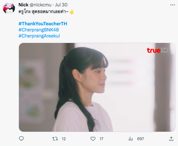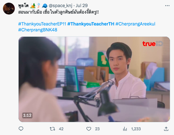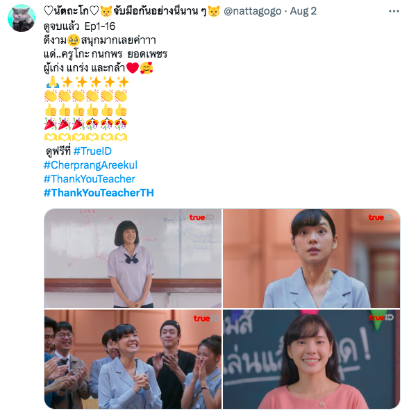 เป็นซีรีส์ที่มีแฟนๆ ให้การตอบรับกระแสชื่นชมเป็นอย่างมากสำหรับ ซีรีส์ Thank you teacher ที่ในครั้งนี้ได้นักแสดงหลักอย่าง “เฌอปราง อารีย์กุล” กับบทบาทของ “ครูโกะ” พร้อมทั้งยังเต็มไปด้วยนักแสดงอีกมากมายอาทิ เอ็มดี ณัฐพงศ์, เปิ้ล หัทยา, ฮูพ BNK48, นงค์ ปิยะโชติ, แพต รัณนภันต์, ตั้ว เสฎฐวุฒิ และ เพรียว เพียวรินทร์ ฯลฯ โดยกระแสในโซเชียลเองก็กำลังมาแรง ทั้งคำชื่นชม พร้อมทั้งติดแฮชแท็กของซีรีส์ในทุกวันที่มีการออนแอร์ วันนี้ไม่พลาดขอหยิบเอาคำชมที่หากนักแสดง ทีมงานได้เห็นจะต้องชื่นใจอย่างแน่นอนมาให้ได้ติดตามกัน