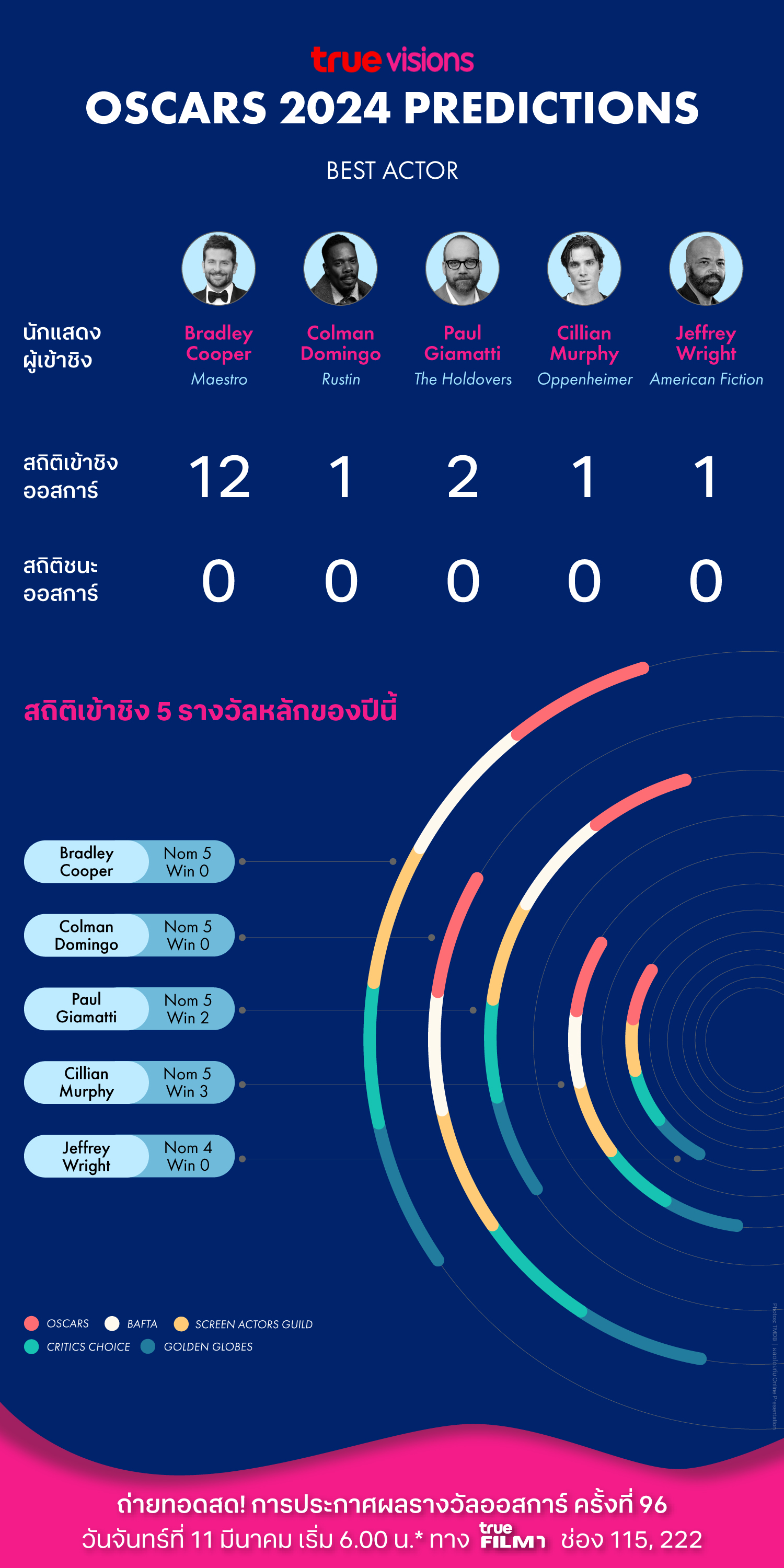 หลังจากเชือดเฉือนกันมาหลายเวที ผู้เข้าชิงรางวัลสาขานักแสดงนำชายในปีนี้เหลือให้ลุ้นเพียง 2 คน คือ คิลเลียน เมอร์ฟี่ (Oppenheimer) และ พอล จิอาแมตติ (The Holdovers) ส่วนผู้เข้าชิงคนอื่นๆ ทั้ง แบรดลีย์ คูเปอร์ (Maestro), โคลแมน ดอมิงโก (Rustin) และเจฟฟรี่ย์ ไรท์ (American Fiction) ก็ต้องยอมรับว่าปีนี้อาจยังไม่ใช่เวลาของพวกเขา