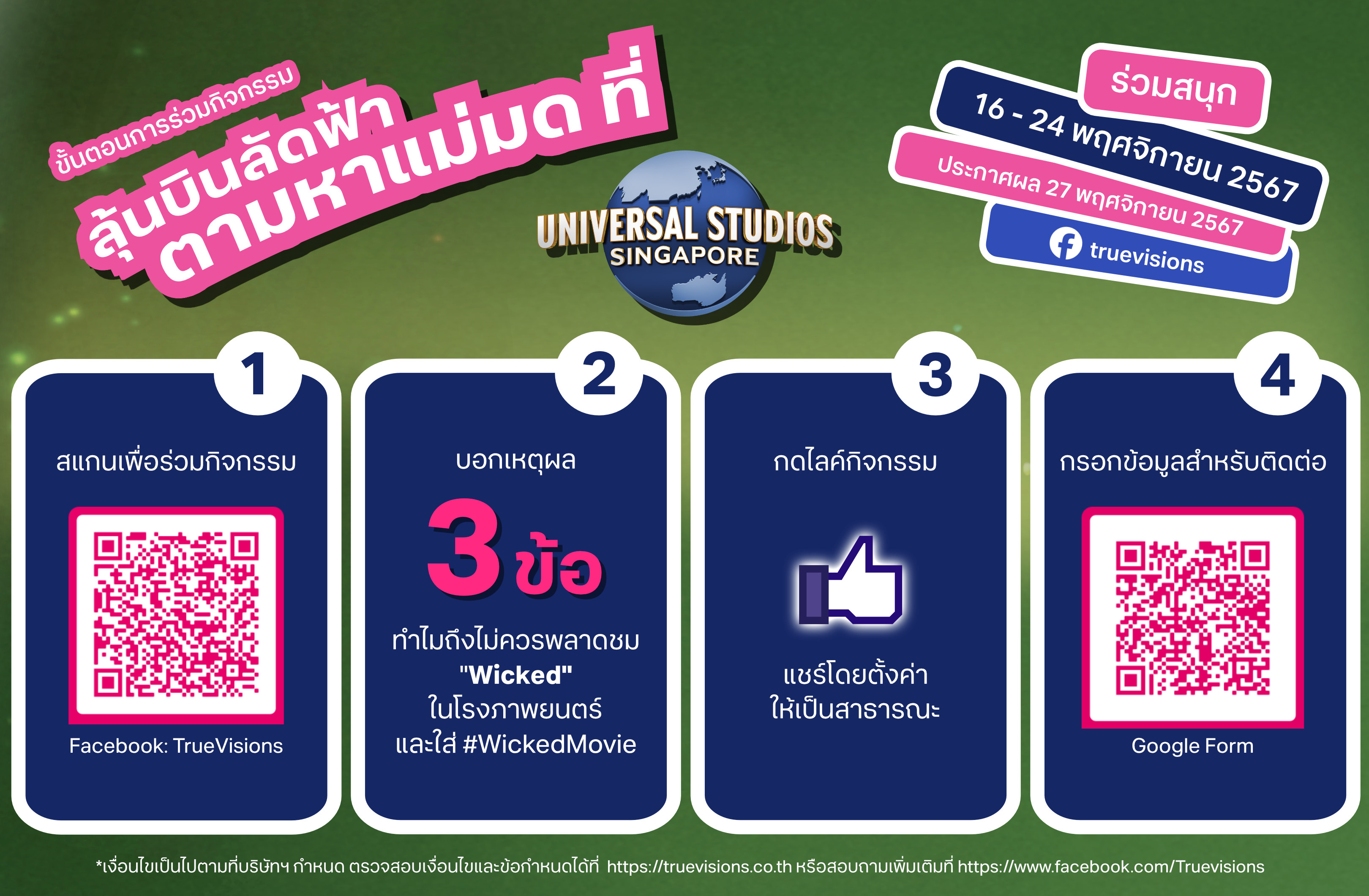 กิจกรรม “Wicked: Watch & Win” จัดขึ้นโดยบริษัท ทรู วิชั่นส์ กรุ๊ป จำกัด และ บริษัท ไบรท์ นาว จำกัด (รวมเรียกว่า”บริษัทฯ”) สำหรับสมาชิก True Visions และ True Visions Now (“ผู้เข้าร่วมกิจกรรม”) โดยมีรายละเอียด ดังนี้