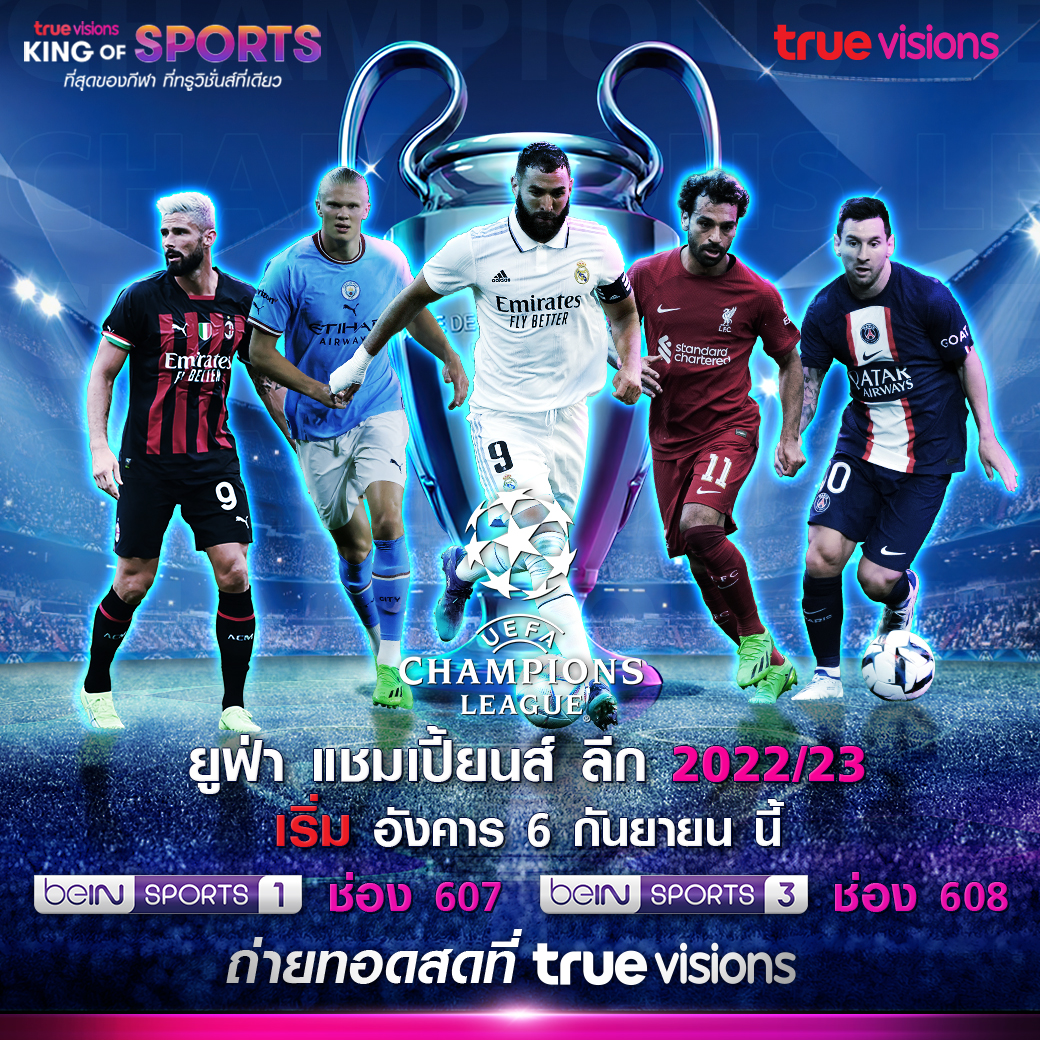 ทรูวิชั่นส์ คิง ออฟ สปอร์ต ตอกย้ำการเป็นผู้นำคอนเทนต์กีฬาระดับโลก ยิงสด ยูฟ่า แชมเปี้ยนส์ ลีก 2022/23 ศึกฟุตบอลยุโรปถ้วยใหญ่ที่ทุกทีมอยากครอบครอง เริ่มรอบแบ่งกลุ่มอังคารที่ 6 กันยายนนี้ แฟนบอลตัวจริงพลาดไม่ได้ทางทรูวิชั่นส์ ช่อง beIN SPORTS 1 (ช่อง 607) และ beIN SPORTS 3 (ช่อง 608)