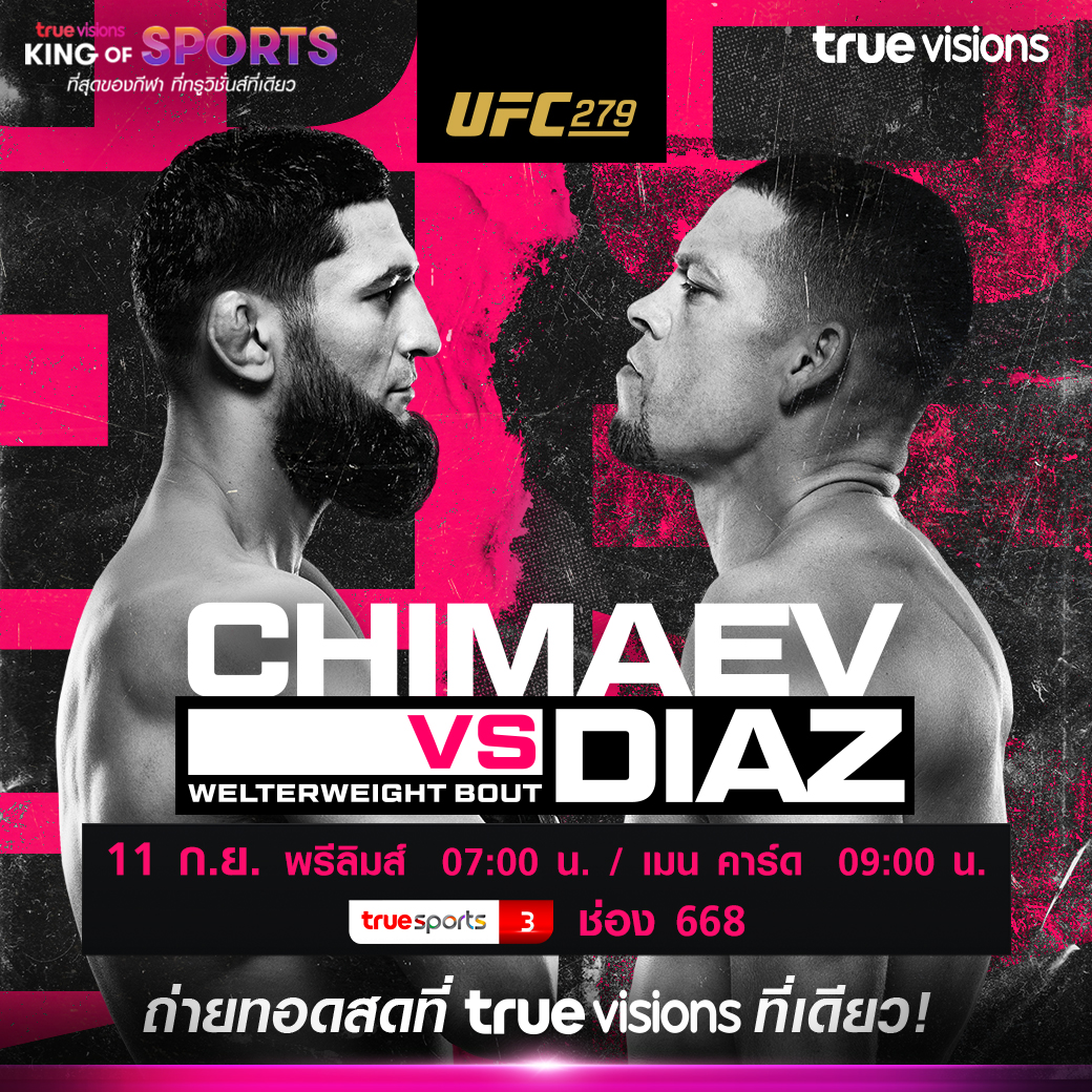 ทรูวิชั่นส์ ตอกย้ำการเป็นผู้นำคอนเทนต์กีฬาระดับโลก พร้อมเสนอกีฬาต่อสู้แบบผสมที่ได้รับความนิยมเป็นอันดับ1 จากแฟนๆทั่วโลก กับศึกใหญ่ศึกแห่งศักดิ์ศรี ยูเอฟซี 279 คู่เอกนักสู้ชาวสวีดิช เชื้อสายรัสเซีย คัมซาด ชิมาเยฟ พบแบดบอยของวงการชาวอเมริกัน เนท ดิแอซ ในพิกัดรุ่นเวลเตอร์เวท เช้าวันอาทิตย์ที่ 11 กันยายนนี้ ตั้งแต่ 07.00 น. เอ็กซ์คลูซีฟทางทรูวิชั่นส์ ช่องทรูสปอร์ต 3 (668) ถ่ายทอดสดจากทีโมบิล อารีน่า ลาสเวกัส