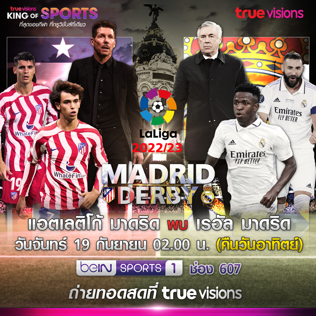 ทรูวิชั่นส์ ตอกย้ำการเป็นผู้นำคอนเทนต์กีฬาระดับโลกอีกครั้ง กับการถ่ายทอดสดฟุตบอล ลา ลีกา สเปน ให้ได้รับชมครบทุกคู่ในช่วงสุดสัปดาห์ พลาดไม่ได้กับ “มาดริด ดาร์บี้” ศึกชิงเมือง อัลเลติโก มาดริด ปะทะ แชมป์เก่า เรอัล มาดริด หนึ่งในเกม ดาร์บี้ แมตช์ ที่เร้าใจที่สุดในโลกลูกหนัง ลุ้นทีมโปรดแบบสด ๆ ในเกมที่มีศักดิ์ศรีเป็นเดิมพัน เช้าตรู่วันจันทร์ที่ 19 กันยายนนี้ เวลา 02.00 น. สด! ติดขอบสนามที่ ทรูวิชั่นส์ ช่อง beIN Sports 1 (607)