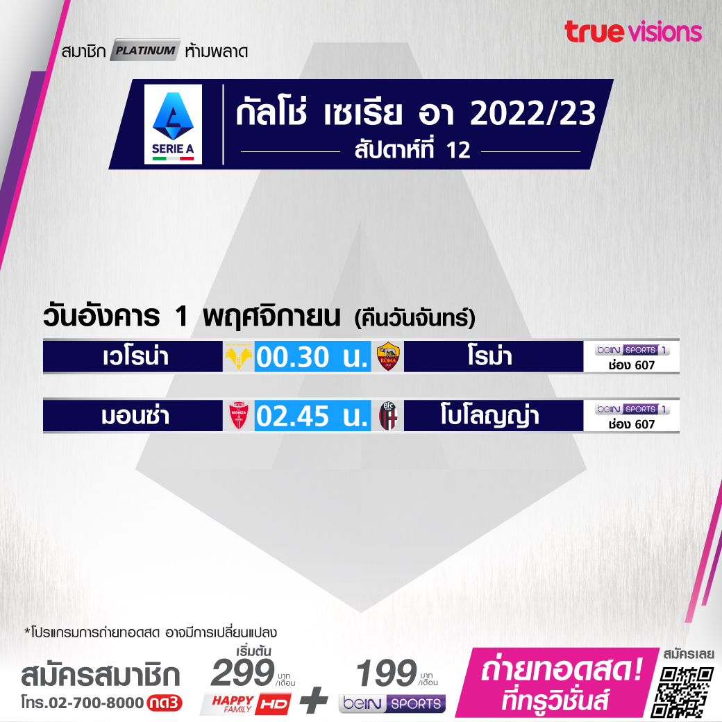 Tue 1 Monza vs. Bologna เวลา 02.45-04.45 ทางช่อง beIN 1 (607)