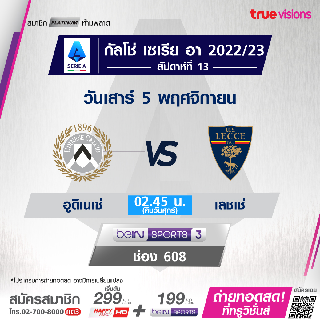 Udinese vs. Lecce เวลา 02.45-04.45 ทางช่อง beIN Sports 3 (608)