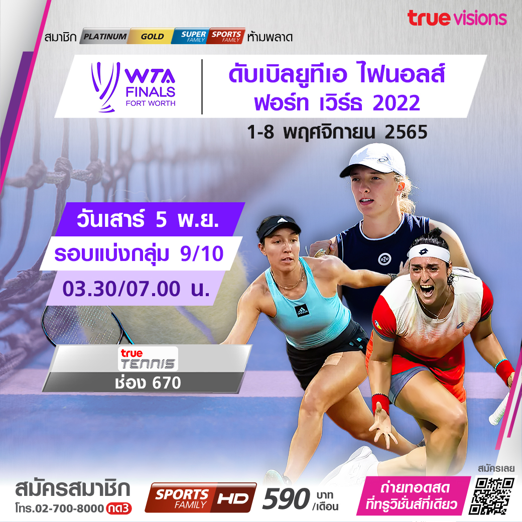 แฟนกีฬาเทนนิสต้องไม่พลาด!!! ศึกใหญ่ปิดท้ายปีที่จะวัดกันว่าใครจะเป็นราชินีของวงการเทนนิสหญิงปี 2022 กับรายการ ดับเบิ้ลยูทีเอ ไฟนอลส์ ฟอร์ทเวิร์ธ ที่มี 8 นักเทนนิสหญิงที่เก่งที่สุดของปีนี้มาชิงแชมป์ที่สำคัญที่สุด พร้อมเงินรางวัลมหาศาล 5 ล้านเหรียญสหรัฐฯ ชมสดครบทุกรอบ ทางทรูวิชั่นส์ ที่เดียว