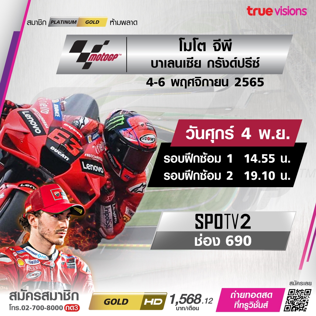 ศึกเจ้าความเร็ว โมโต จีพี ฤดูกาล 2022 เดินทางมาถึงสนามสุดท้ายแล้วที่แดนกระทิงประเทศสเปน กับรายการ บาเลนเซีย กรังด์ปรีซ์ แชมป์โลก 2022 จะตกเป็นของใคร ลุ้นกันสดๆ ครบทุกช่วง ชมสด ทางทรูวิชั่นส์