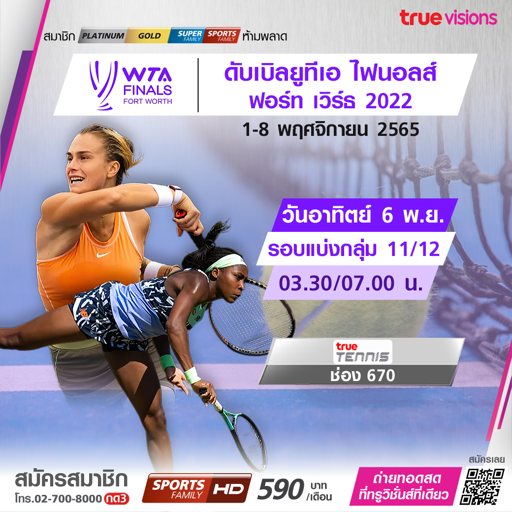 แฟนกีฬาเทนนิสต้องไม่พลาด!!! ศึกใหญ่ปิดท้ายปีที่จะวัดกันว่าใครจะเป็นราชินีของวงการเทนนิสหญิงปี 2022 กับรายการ ดับเบิ้ลยูทีเอ ไฟนอลส์ ฟอร์ทเวิร์ธ ที่มี 8 นักเทนนิสหญิงที่เก่งที่สุดของปีนี้มาชิงแชมป์ที่สำคัญที่สุด พร้อมเงินรางวัลมหาศาล 5 ล้านเหรียญสหรัฐฯ ชมสดครบทุกรอบ ทางทรูวิชั่นส์ ที่เดียว