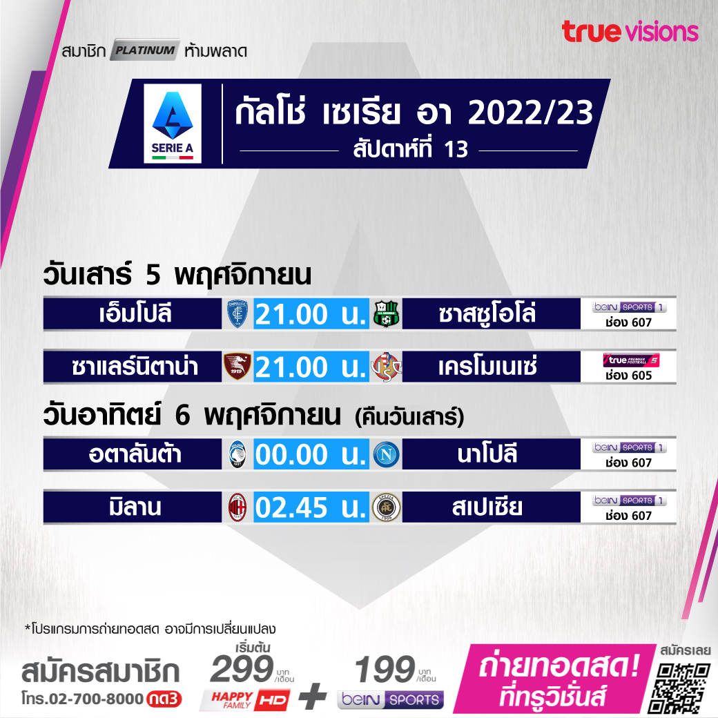 Empoli vs. Sassuolo เวลา 21.00-23.00 ทางช่อง beIN Sports 1 (607)