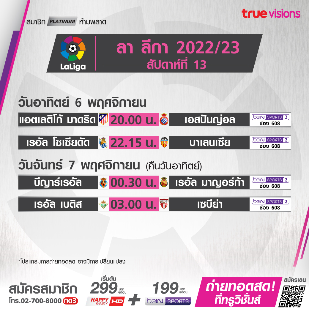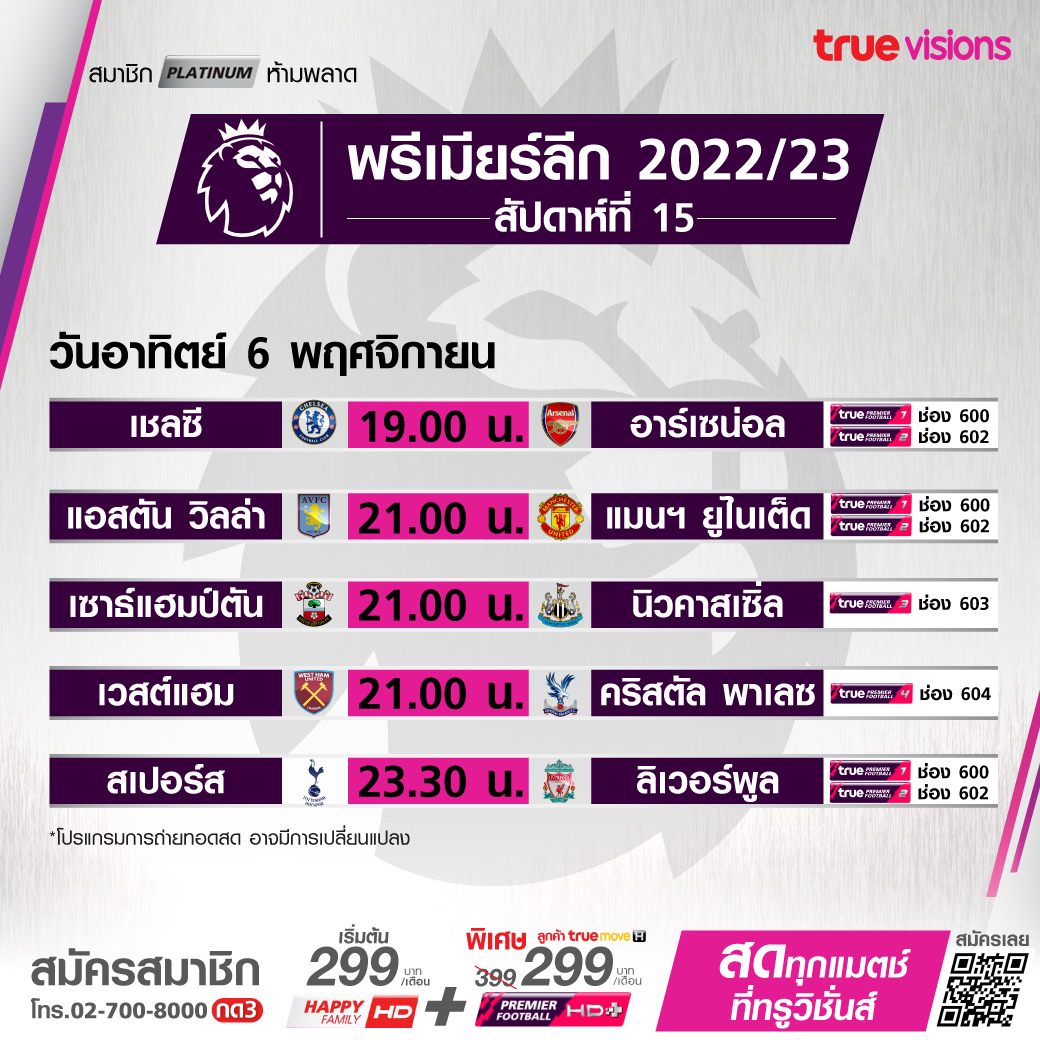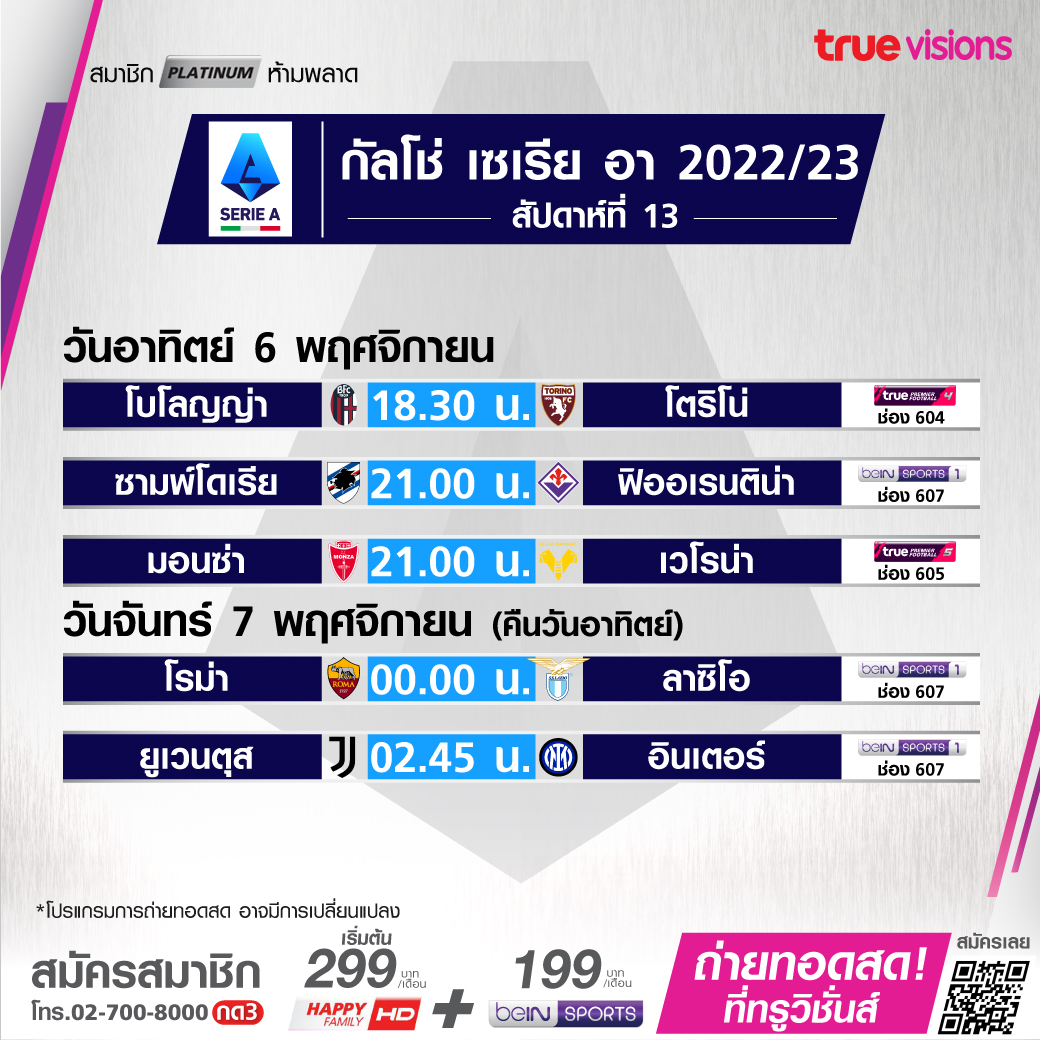 วันนี้มีอะไรดูที่ ทรูวิชั่นส์ ประจำวันอาทิตย์ที่ 6 พฤศจิกายน 65 ยังอัดแน่นไปด้วยกีฬาระดับโลกมากมาย ไม่ว่าจะเป็นศึกฟุตบอลลีกยุโรปอย่าง พรีเมียร์ลีก อังกฤษ, กัลโช่ เซเรีย อา อิตาลี, ลา ลีกา สเปน และ ลีก เอิง ฝรั่งเศส นอกจากนี้ยังมีกีฬาอื่นๆ ให้ได้ตามเชียร์กันอีกมากมาย ไม่ว่าจะเป็นศึกโมโต จีพี รายการ บาเลนเซีย กรังด์ปรีซ์, แบดมินตัน บีดับเบิ้ลยูเอฟ รายการ ไฮโล โอเพ่น, กอล์ฟพีจีเอ ทัวร์ รายการ เวิลด์ ไวด์ เทคโนโลยี แชมเปี้ยนชิพ, เอเชียนทัวร์ รายการ อินเตอร์เนชั่นแนล ซีรี่ส์ โมร็อคโค, กอล์ฟหญิงแอลพีจีเอ ทัวร์ รายการ เจแปน คลาสสิค, ศึกเทนนิส ดับเบิ้ลยูทีเอ ไฟนอลส์ 2022, รักบี้ ออทัมน์ อินเตอร์เนชันแนลส์ ซีรีส์ และศึกอเมริกันฟุตบอล เอ็นเอฟแอล งานนี้ ทรูวิชั่นส์ จัดเต็ม ยิงสดให้ชมกันถึงบ้าน