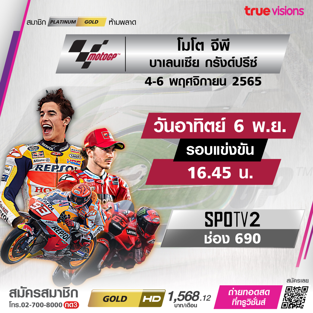 ศึกเจ้าความเร็ว โมโต จีพี ฤดูกาล 2022 เดินทางมาถึงสนามสุดท้ายแล้วที่ประเทศสเปน กับรายการ บาเลนเซีย กรังด์ปรีซ์ ในรอบการแข่งขันจริง แชมป์โลก 2022 จะตกเป็นของใคร ลุ้นกันสดๆ ครบทุกช่วง ชมสด ทางทรูวิชั่นส์