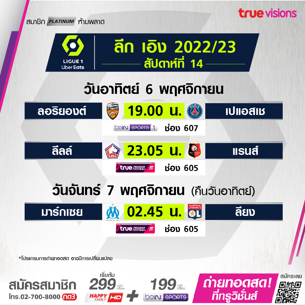 Lorient vs. PSG เวลา 19.00-21.00 ทางช่อง TPF 5 (605)