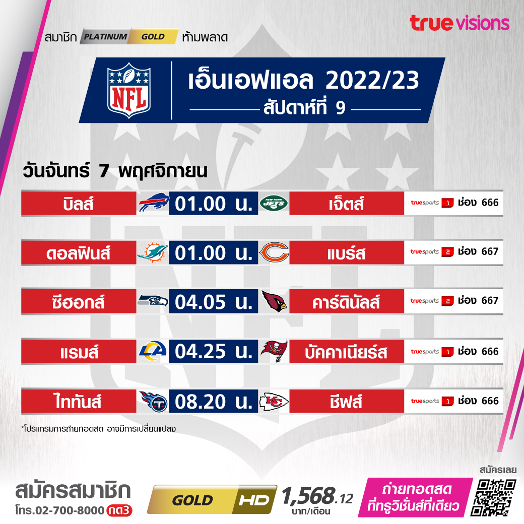วันจันทร์ 7 Bills vs. Jets เวลา 01.00-04.25 ทางช่อง TS1 (666)