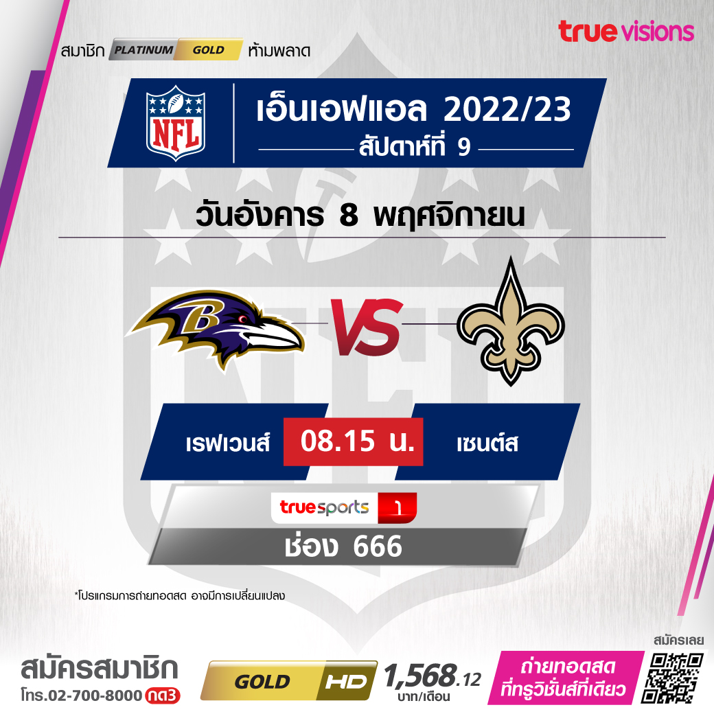 วันอังคาร 8 Ravens vs. Saints เวลา 08.15-11.30 ทางช่อง TS1 (666)