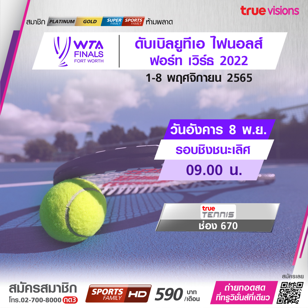 แฟนกีฬาเทนนิสต้องไม่พลาด!!! ศึกใหญ่ปิดท้ายปีกับรายการ ดับเบิ้ลยูทีเอ ไฟนอลส์ ฟอร์ทเวิร์ธ 2022 ที่มี 8 นักเทนนิสหญิงที่เก่งที่สุดของปีนี้มาชิงแชมป์ที่สำคัญที่สุด พร้อมเงินรางวัลมหาศาล 5 ล้านเหรียญสหรัฐฯ เดินทางมาถึงในรอบชิงชนะเลิศแล้ว ใครจะคว้าแชมป์เป็นสุดยอดนักเทนนิสหญิงในปีนี้ ชมสด ทางทรูวิชั่นส์ ที่เดียว