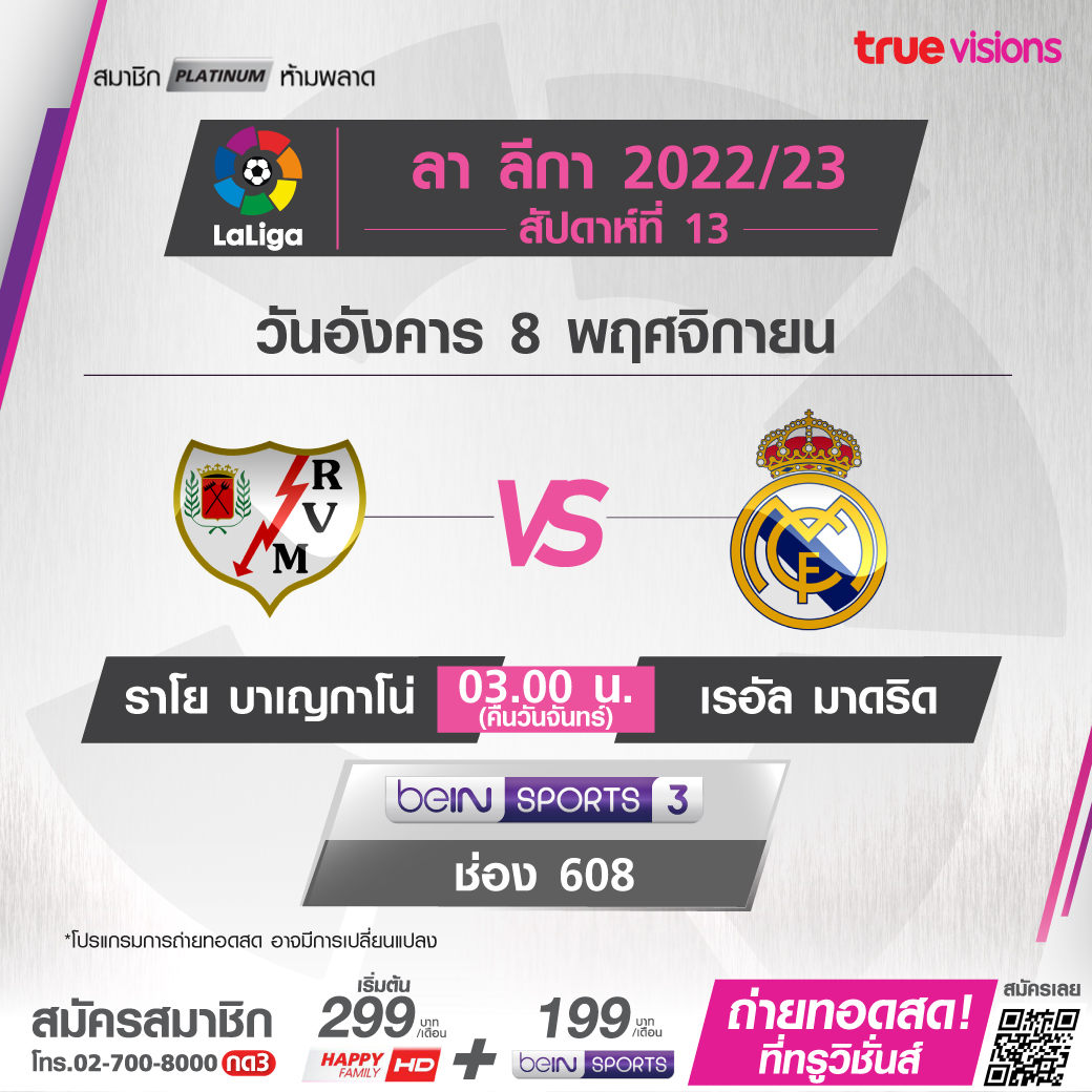 Rayo vs. Real Madrid เวลา 03.00-05.00 ทางช่อง beIN Sports 3 (608)