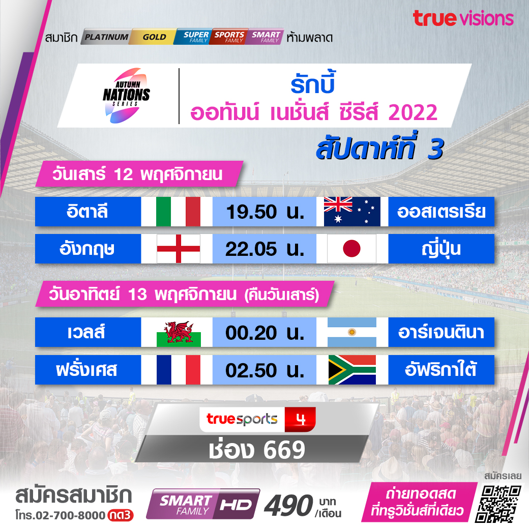 ความมันส์ของศึกรักบี้ ฟุตบอล ระดับนานาชาติ เข้าสู่สัปดาห์ที่ 3 ชาติชั้นนำของโลกมาปะทะฝีมือกันด้วยทีมที่แข็งแกร่งที่สุด ในรายการ ออทัมน์ เนชั่นส์ ซีรี่ส์ 2022 ชมสด จุใจทุกแม็ตช์ ชมสด ทางทรูวิชั่นส์ ที่เดียว