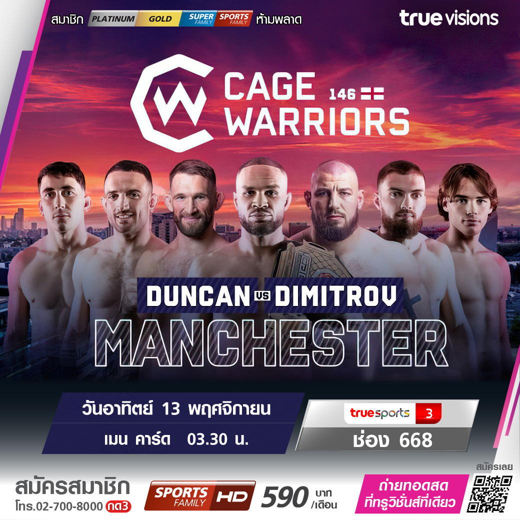 อีกหนึ่งความมันส์ของกีฬาต่อสู้แบบเอ็มเอ็มเอ ที่ส่งตรงมาจากอังกฤษให้แฟนๆ ได้ชมกันสดๆ กับศึก เคจ วอร์ริเออร์ส 146 คู่เอกเป็นการชิงแชมป์รุ่นมิดเดิ้ลเวต คริสเตียน ลีรอย ดันแคน พบ มาเรียน ดิมิทรอฟ สดจาก แมนเชสเตอร์ ชมสด ทางทรูวิชั่นส์ ที่เดียว