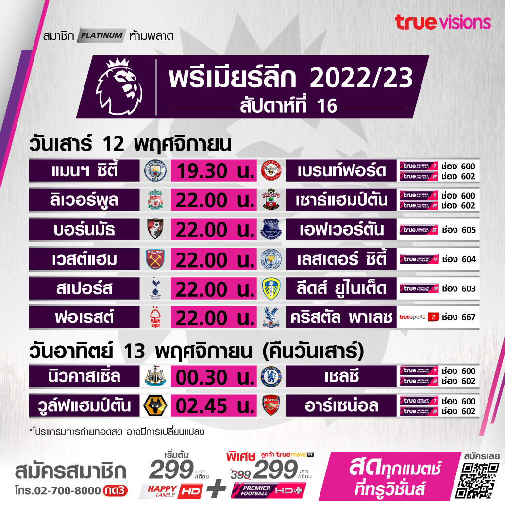 Sat 12 West Ham vs. Leicester เวลา 22:00 - 00:00 ทางช่อง TPF 4 (604)