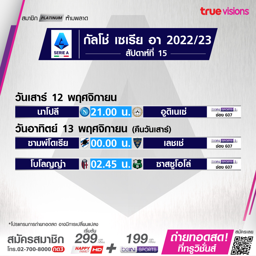 Napoli vs Udinese เวลา 21.00-23.00 ทางช่อง beIN 1 (607)