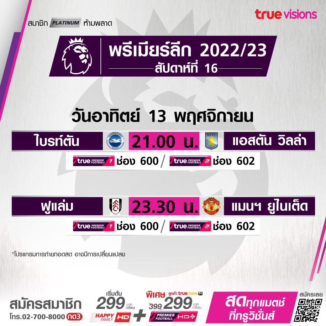 Brighton vs. Villa เวลา 21.00-23.00 ทางช่อง TPF 1(600) / TPF 2 (602)
