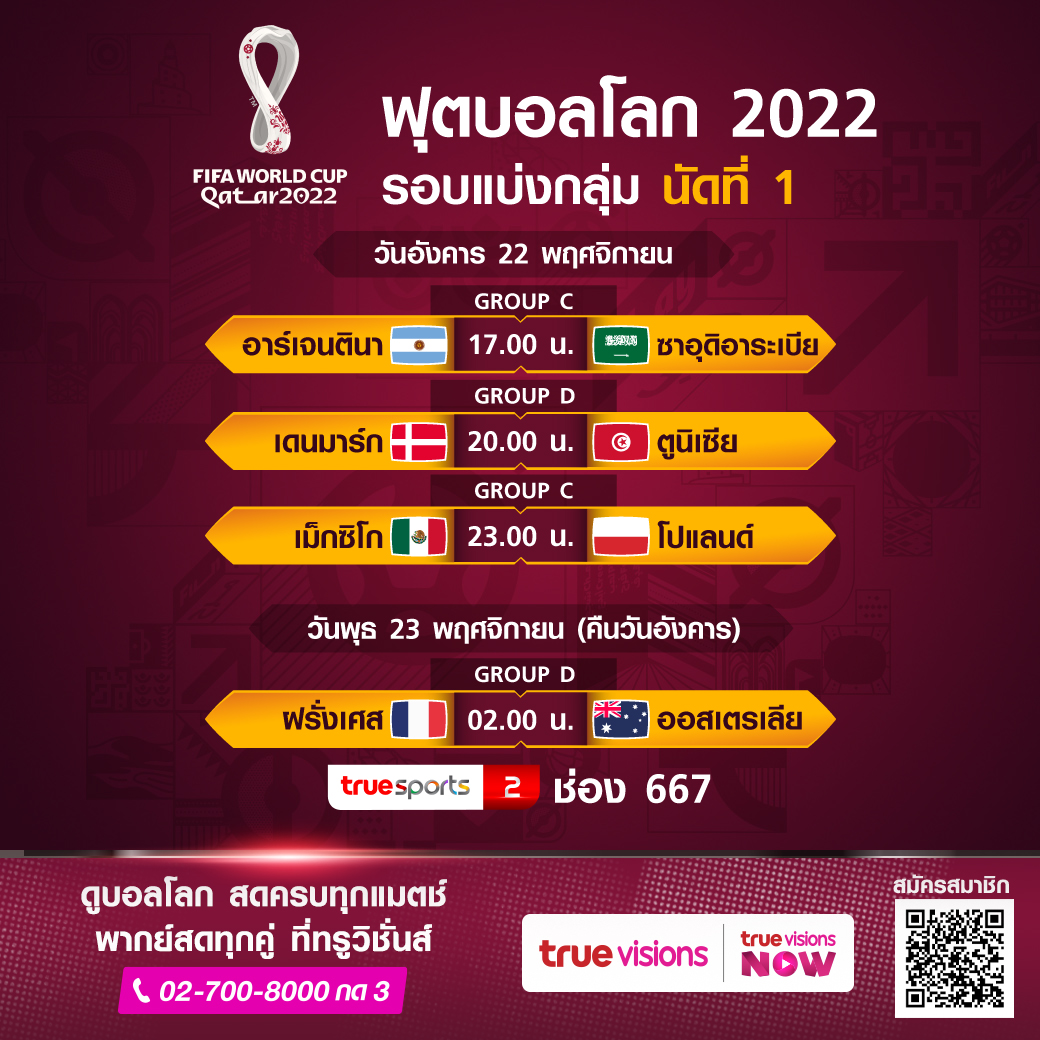 วันนี้มีอะไรดูที่ ทรูวิชั่นส์ ประจำวันอังคารที่ 22 พฤศจิกายน 65 ไฮไลท์สำคัญแน่นอนว่าต้องเป็นศึกฟุตบอลโลก 2022 รอบแบ่งกลุ่มนัดแรก มีให้ติดตามลุ้นตามเชียร์กัน 4 คู่เต็มๆ นอกจากนี้ยังมีศึกเทนนิส เดวิส คัพ ไฟนอลส์ งานนี้ ทรูวิชั่นส์ จัดเต็ม ยิงสดให้ชมกันถึงบ้าน