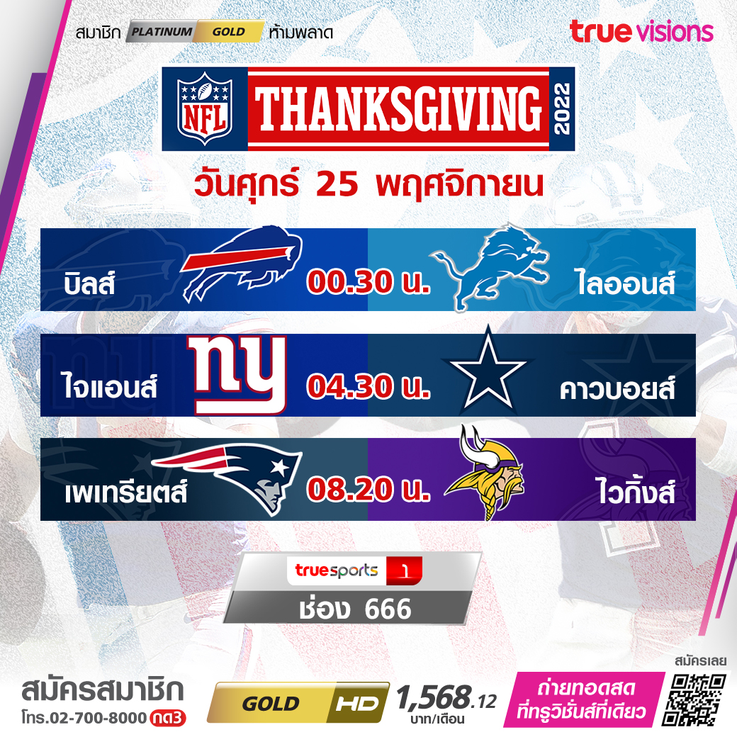 วันศุกร์ 25 Patriots vs. Vikings (L) 08.20-11.30 ทางช่อง TS1 (666)