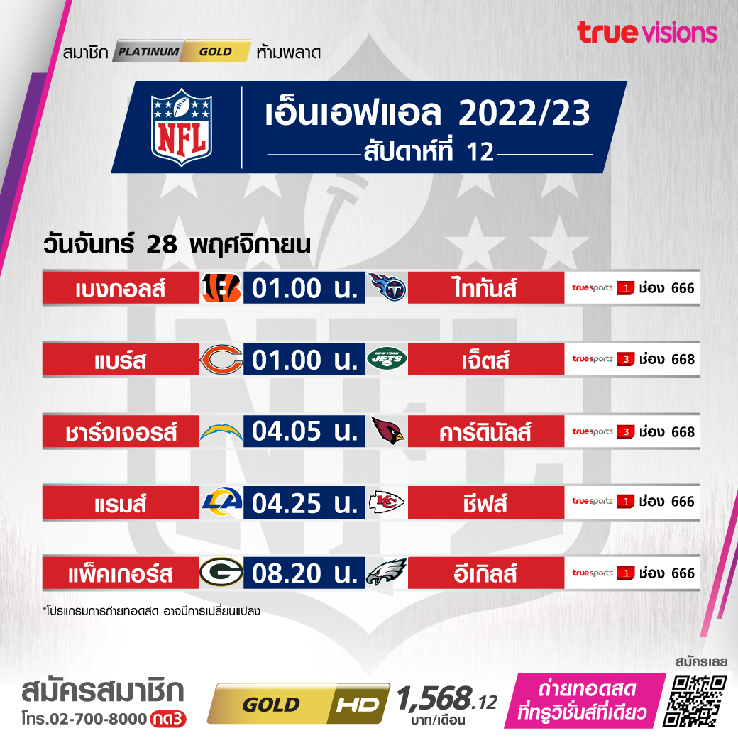 วันจันทร์ 28 Bengals vs. Titans เวลา 01.00-04.15 ทางช่อง TS1 (666)