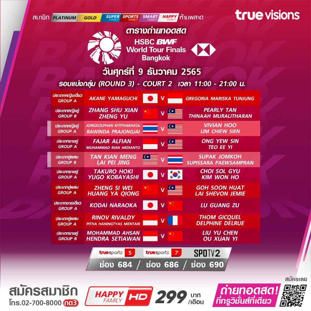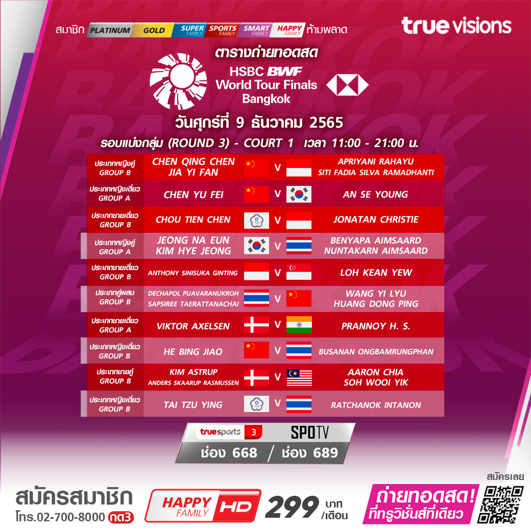 แบดมินตันรายการใหญ่ส่งท้ายปี บีดับเบิ้ลยูเอฟ เวิลด์ ทัวร์ ไฟนอลส์ แบงค็อก 2022 เข้าสู่วันที่สามของรอบแบ่งกลุ่ม ร่วมลุ้นและเชียร์ทีมแบดมินตันไทย ปะทะกับมือระดับโลกที่มาโชว์ฝีมือคับคั่ง สดครบทุกรอบ ชมสด ทางทรูวิชั่นส์ ที่เดียว