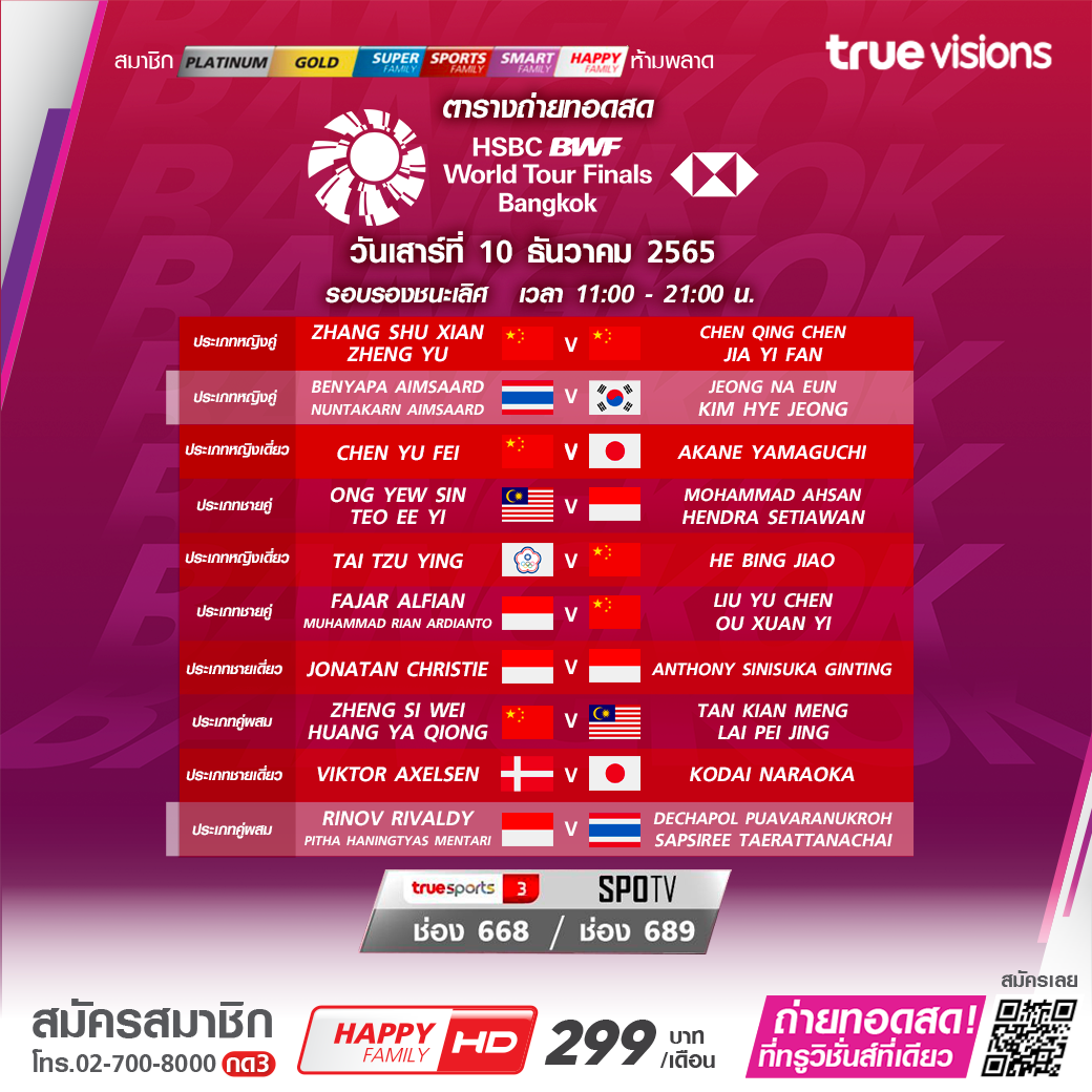 แบดมินตันรายการใหญ่ส่งท้ายปี บีดับเบิ้ลยูเอฟ เวิลด์ ทัวร์ ไฟนอลส์ แบงค็อก 2022 เข้าสู่รอบรองชนะเลิศแล้ว ร่วมลุ้นและเชียร์ทีมแบดมินตันไทยให้เข้าสู่รอบชิงชนะเลิศ เพื่อคว้าแชมป์ให้ได้ ชมสด ทางทรูวิชั่นส์ ที่เดียว