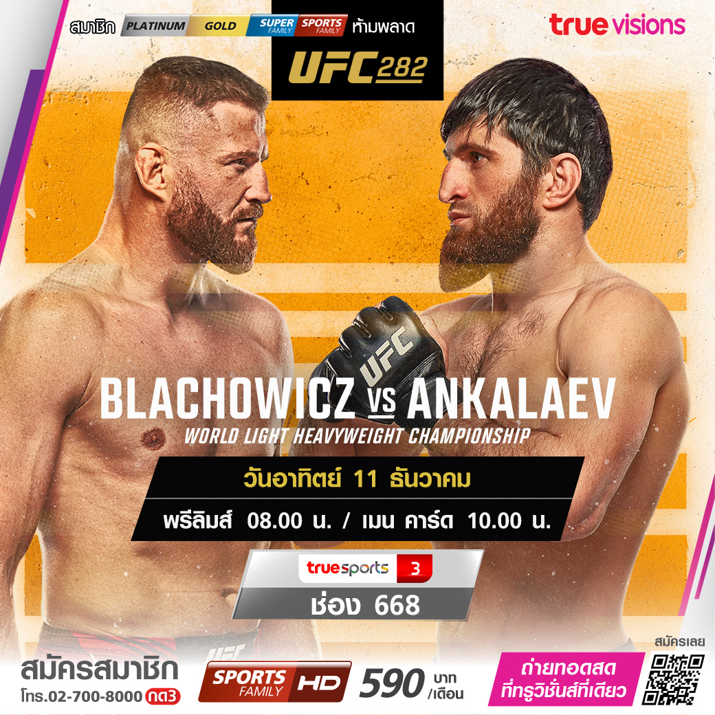 มันส์กับศึกใหญ่ประจำเดือน UFC 282 คู่เอก ชิงแชมป์รุ่นไลต์เฮฟวี่เวต ระหว่าง 2 นักชกพันธุ์ดุแห่งยุค แยน บลาโฮวิช อดีตแชมป์รุ่นนี้จาก โปแลนด์ ปะทะ มาโกเมด อันคาลาเยฟ จากรัสเซีย สดจุใจ ทั้งช่วงพรีลิมส์ และเมน คาร์ด จากสังเวียน ที-โมบาย อารีน่า ลาสเวกัส สหรัฐอเมริกา ชมสด ทางทรูวิชั่นส์ ที่เดียว