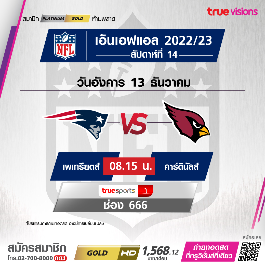 วันอังคาร 13 Patriots vs. Cardinals เวลา 08.15-11.30 ทางช่อง TS1 (666)