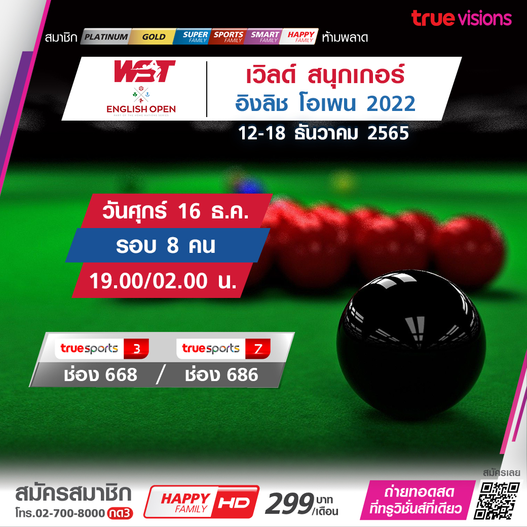 สนุกเกอร์เก็บคะแนนสะสมโลก รายการ อิงลิช โอเพ่น เชียร์นักสนุกเกอร์ระดับโลกชิงถ้วยรางวัลอันทรงเกียรติ สตีฟ เดวิส โทรฟี่ ชมสดแบบจุใจในรอบ 8 คนสุดท้าย ชมสด ทางทรูวิชั่นส์ ที่เดียว