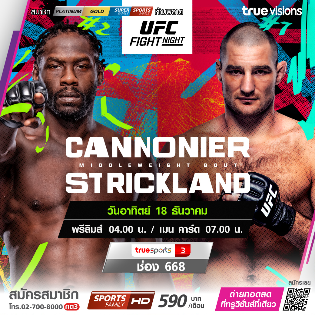 ดวลกันเป็นไฟต์สุดท้ายของปี 2022 ยูเอฟซี ไฟต์ ไนท์ จากสังเวียน ยูเอฟซี เอเพ็กซ์ ลาส เวกัส คู่เอก รุ่นมิดเดิลเวต จาเร็ด แคนโนเนียร์ รองแชมป์อันดับ 3 ที่เคยขึ้นชิงแชมป์รุ่นนี้มาแล้ว พบ รองแชมป์อันดับ 7 ฌอน สตริคแลนด์ ชมสดจุใจครบทั้ง ช่วง พรีลิมส์ และ เมน คาร์ด ชมสด ทางทรูวิชั่นส์ ที่เดียว