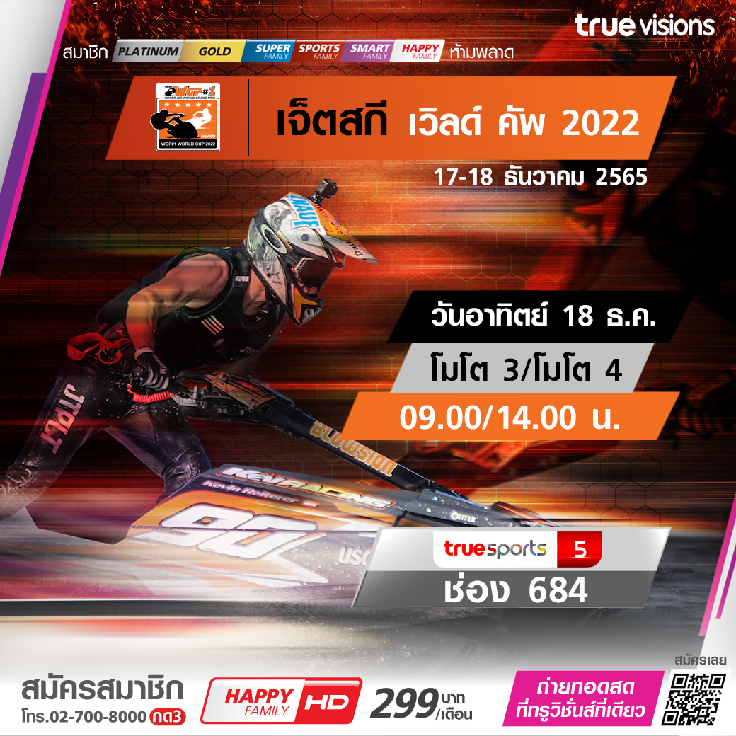 ยิ่งใหญ่ส่งท้ายกับความมันระดับโลกที่จะเกิดขึ้นในประเทศไทย ที่หาดจอมเทียน พัทยา จ. ชลบุรี กับการแข่งขันเจ็ตสกี เวิลด์ คัพ 2022 ตื่นตา ตื่นใจกับลีลาของนักขับไทยและมือระดับโลก ที่จะมาชิงชัยเพื่อเป็นเจ้าของแชมป์แห่งศักดิ์ศรี ชมสด ทางทรูวิชั่นส์ ที่เดียว
