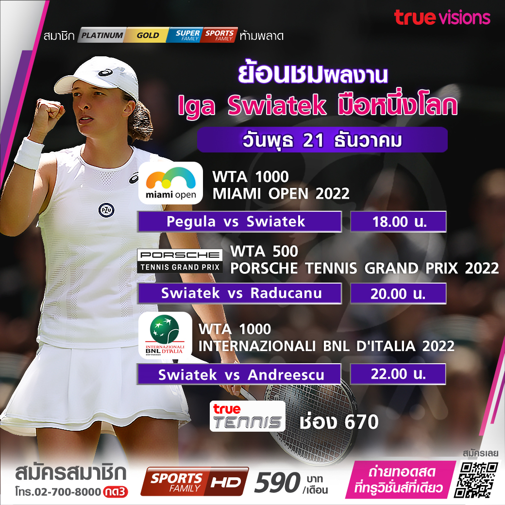 วันนี้มีอะไรดูที่ ทรูวิชั่นส์ ประจำวันพุธที่ 21 ธันวาคม 65 ไปย้อนชมผลงานของยอดนักเทนนิสสาว Iga Swiatek มือหนึ่งของโลกคนปัจจุบันกับเส้นทางการคว้าแชมป์ในแต่ละรายการ งานนี้ ทรูวิชั่นส์ จัดเต็มให้ชมกันถึงบ้าน