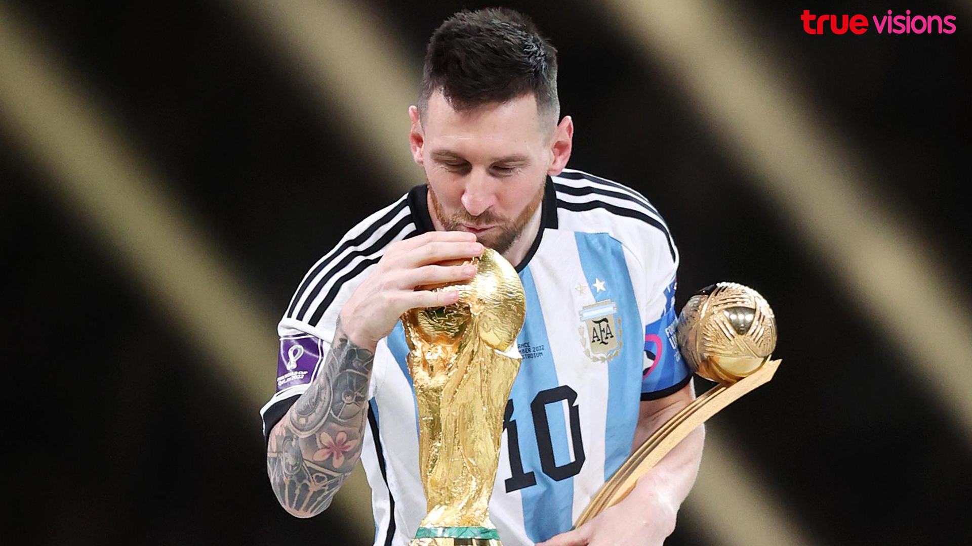 ลิโอเนล เมสซี่ กัปตันทีม อาร์เจนตินา ฉลองแชมป์แบบเก๋ไก๋ด้วยการนำถ้วยแชมป์ฟุตบอลโลกไปนอนกอด